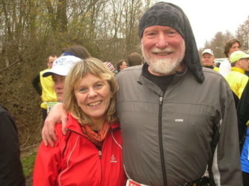 Die letzten 2 km laufe ich schließlich mich gut unterhaltend zeit- und schmerzvergessend mit einem Debütanten und wir gelangen gemeinsam in Siegerpose gerade noch im Zeitlimit ins Ziel, wo meine liebe Birgit trotz regennasser Kälte auf mich wartet. Die Sekunden später stattfindende Umarmung lässt mich die stundenlangen Strapazen nun temporär in einem besseren Licht erscheinen.