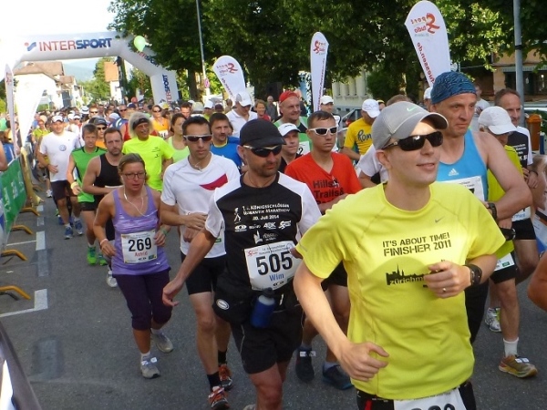 15 Minuten vor dem Start gehe ich in den Startblock, der von der Morisse rund 100 Meter entfernt ist. Der Moderator gibt uns schon Informationen zum Rennverlauf. Dann wird der Mann mit der Startnummer 1 ans Mikro gerufen: Marco Diehl, der Vielstarter mit Zeiten von rund 2.40 Stunden. Heute soll es für ihn ein taktisches Rennen werden. Ob er den Marathon für sich entscheiden kann, weiß ich nicht, aber um den Gesamtsieg wird er sicher mitlaufen. Marco ermahnt noch alle Teilnehmer, heute die Zeit nicht so streng in den Vordergrund zu legen, sondern aufgrund der Hitze eher den Focus auf Erlebnis legen.