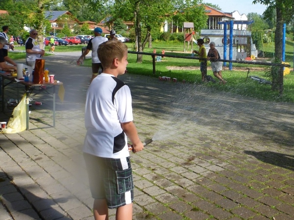 Dann führt unser Weg an einer Unterkunft namens „Sommer“ vorbei, ein Vier-Sterne-Haus. An der folgenden Tankstelle macht sich ein Junge eine Gaudi, indem er die Läufer von oben bis unten nass spritzt. Eine Ladung kriege ich auch ab. Die Quittung, ich muss die Kamera trocken legen.