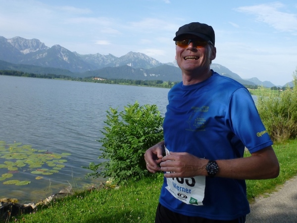 Später führt der Kurs wieder durch das Wiesen- und Schilfgelände. Die Aussicht auf See und Tannheimer Berge könnte fast für ein Titelblatt eines Kalenders reichen. Traumhaft. Die Läufer sind gut gelaunt, besonders wenn ein Fotograf neben der Strecke steht, um die Eindrücke mitzunehmen. Da wird gelacht und die Hand zum Gruß gehoben.