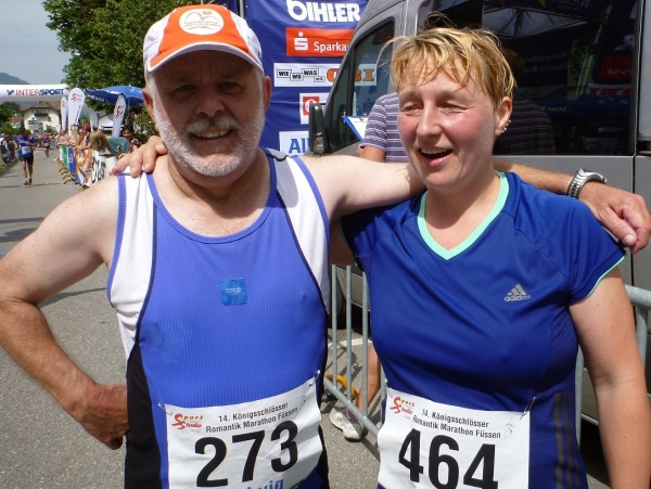 Die Zielverpflegung ist reichhaltig: Mehrere Sorten Fruchtschorlen, Obst, Kuchen und so weiter. Wer noch seinen Futtergutschein zur Verfügung hat, kann im Festzelt die Nudeln mit mehreren Saucen verdrücken. Später laufen dann meine beiden Weidener Läuferinnen unter Jubel ins Ziel. Und ein Dino kommt auch noch. Der ist zum 13. Mal in Füssen, der ist auf seinem 157. Marathon in Deutschland und hat 516 Marathons weltweit geschafft. Gerhard Wally aus Austria, ein Vielfraß im Laufzirkus.