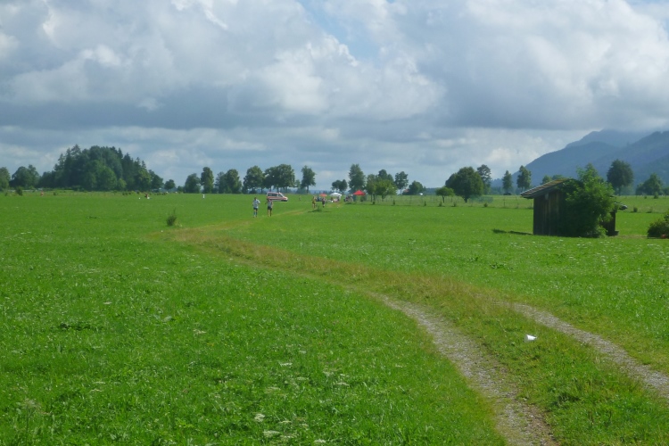 Komplett-VP-Punkt bei km 35, fast in Hohenschwangau. Dann ein kurzes Stück Wiesenweg, ein nasser Untergrund, der nicht gerade beflügelt. Judith kämpft sich an mich heran. Wir überqueren den Zufahrtsweg zu den Schlössern. Jetzt gilt es den Schwansee zu umrunden. Mein Gefühl sagt mir, dass es bergauf geht, aber das kann nicht stimmen, denn dann wäre der See ja ansteigend. Ich höre die Alphornbläser auf der anderen Seite des Sees. Die dortige Wasserstelle bietet einen willkommenen Anlass für ein kurzes Päuschen. Mein Zeitpuffer schwindet.