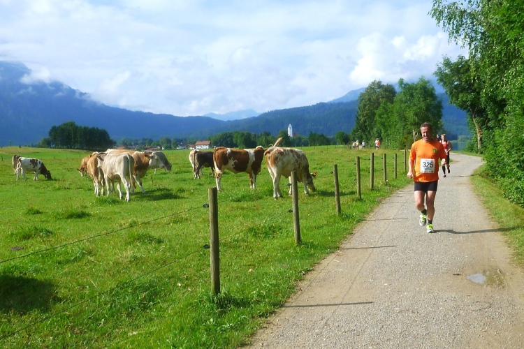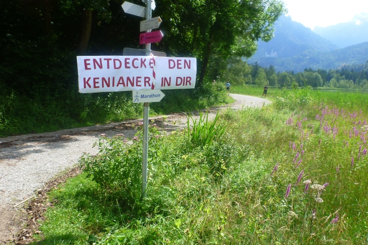 Auf einmal läuft mir Matthias davon, dem rasenden „Eisenbahner“ hinterher. Oder eher: Ich werde 11 km vor dem Ziel langsamer, mein flotter Lauf scheint zu Ende. Wir schwenken auf einen idyllischen Weg am Lussbach. Der plätschert entgegen der Laufrichtung. Ergo müssen wir hier leicht bergauf. Links von uns wäre die Station der Tegelbergbahn. Von dort kann man eine schöne Wanderung mit Blick auf Neuschwanstein unternehmen. Oder auch nach oben wandern? Außerdem führt ein bekannter Berglauf auf den Tegelberg.
