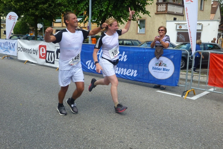3:45-Pacer Dirk fällt mir um den Hals und gratuliert. Kurz nach mir kommt Judith ins Ziel. Wir genießen das alkoholfreie Bier der Brauerei Zötler und viele andere Getränke. Wer mich kennt, weiß, dass ich eigentlich nur laufe, um den leckeren Kuchen im Ziel zu ergattern. Die gute Stimmung ist wirklich ansteckend. Unentwegt kommen Sportler jubelnd ins Ziel, begleitet vom Kommentar des Zielsprechers und angefeuert von vielen Zuschauern. Eine italienische Laufgruppe aus Prato bei Florenz feiert ihre Finisher.