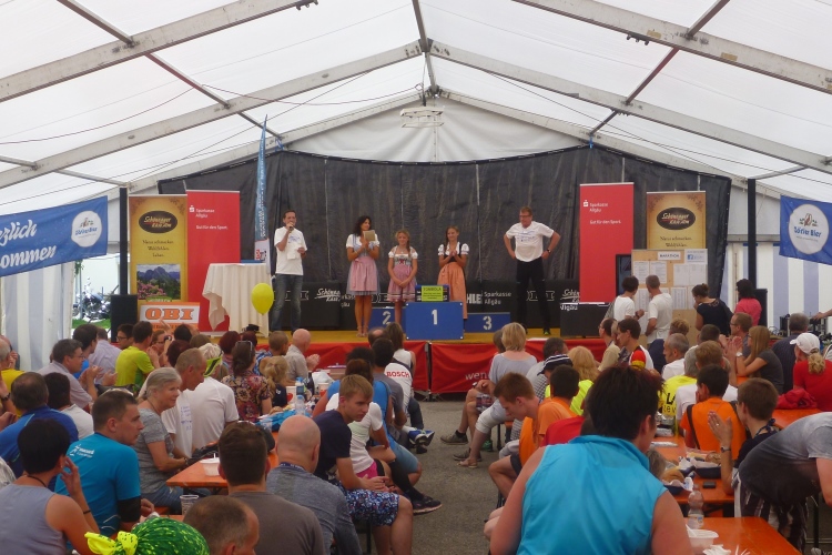 Die Duschen sind schön heiß. Zurück im Marathonzelt haben wir die Prämierungen schon verpasst. Ein Körbchen mit Brot, original Allgäuer Heumilchkäse und einer Flasche „Zötler alkoholfrei“ erhält Judith als Altersklassen-Erste trotzdem. Dann erwartet uns noch die Tombola: An der Verlosung diverser Sachpreise nimmt jede eingeworfene Startnummer teil. Die von Gabriele aus Prato deutet mit blauem Namensschriftzug auf einen männlichen Teilnehmer hin und beschert ihrem Besitzer den zweiten Preis: ein schönes Mountainbike. Damit könnte er eigentlich gleich heim nach Italien radeln, sportlich ist er ja... Der erste Preis, ein Aufenthalt im Wellnesshotel, geht dummerweise nicht an Judith oder mich.