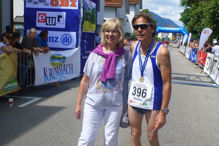 Lesern des Kluftinger-Krimis „Seegrund“ ist der nahe gelegene Alatsee ein Begriff. Wir befinden uns jetzt auf der Alatseestraße und die führt nach oben. Noch 500 Meter zum Ziel, ich fühle mich genötigt, ein paar kurze Gehpausen einzulegen. Unter vier Stunden bleibe ich auf jeden Fall. Viele Zuschauer spornen mich an, ich gebe mir Mühe. Objektiv geht es auf 200 Metern keine 20 Meter nach oben. Das wissen auch drei Verfolger, die hier vorbeiziehen. Oben ein künstlicher Einschnitt mit Fußbrücke darüber. Dann geht es zügig bergab. Ich ziehe an, versuche zu überholen. Die anderen lassen das aber nicht mit sich machen. Die junge Läuferin legt einen Spurt hin und lässt die beiden Herren noch hinter sich. Ich nehme mir die Zeit, die Sambaband abzulichten. Und dann lächelnd ins Ziel: 3:58:35 Stunden. Da freut sich aber einer. Die schöne goldglänzende Medaille überreicht mir eine junge Dame in Dirndl.