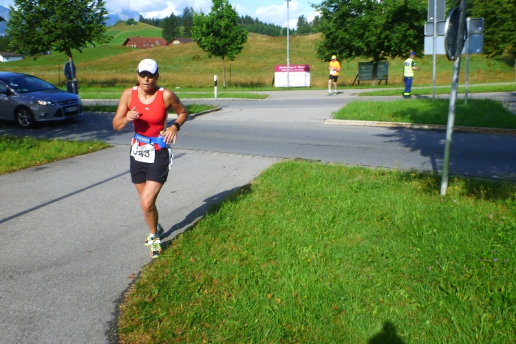 Wir kommen am Hotel Sommer vorbei, das heute seinen Namen zu Recht trägt. Viele Zuschauer auf dem Weg am Lech feuern uns an. Kurz vor der B16-Brücke queren wir den Fluss über ein Wehr. Der Halbmarathonpunkt ist erreicht. Mit 1:54 bin ich recht flott unterwegs und konnte sogar Judith etwas abhängen.