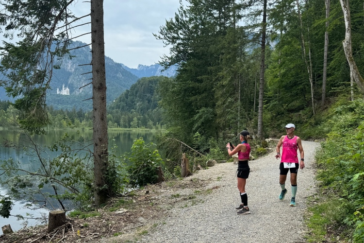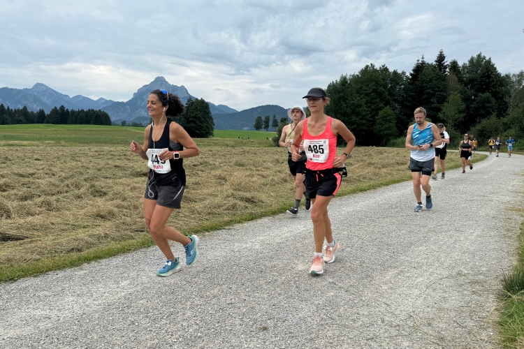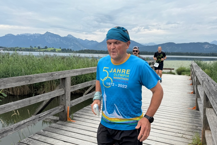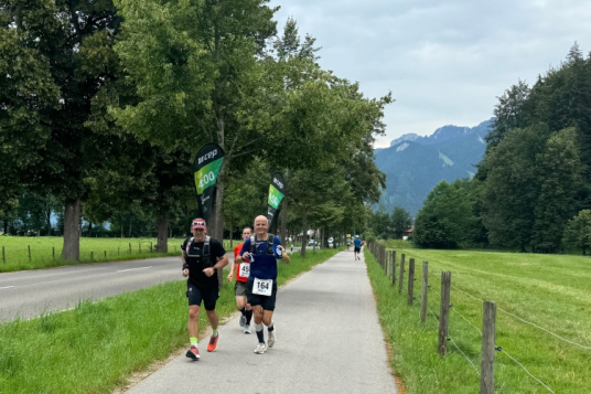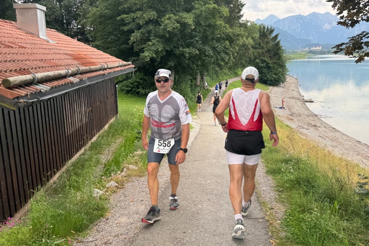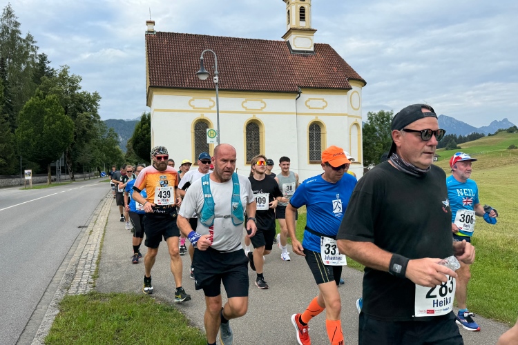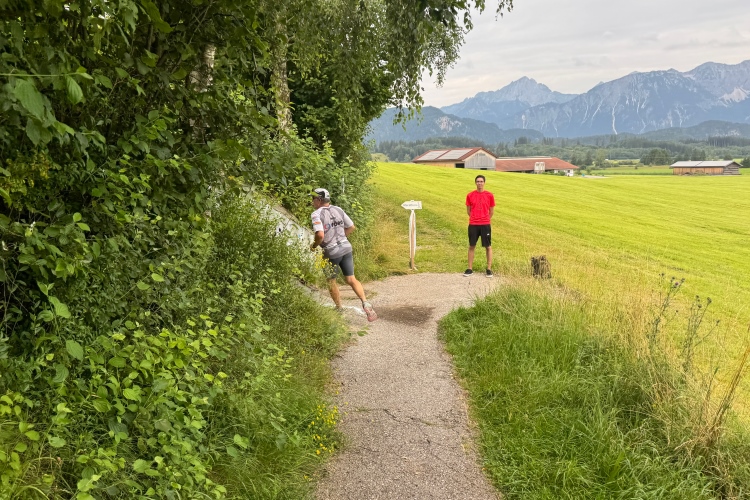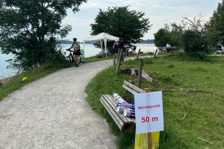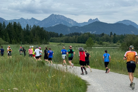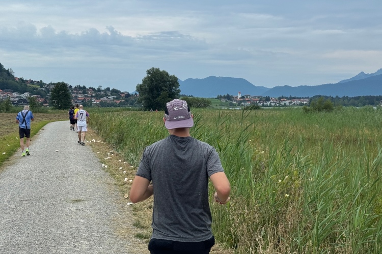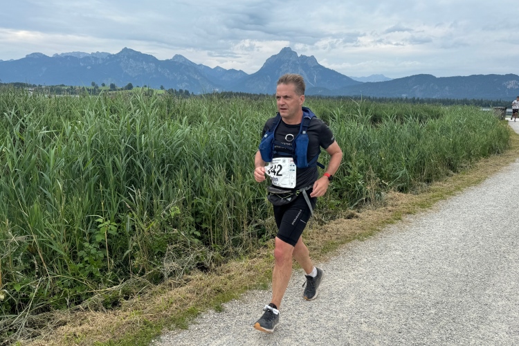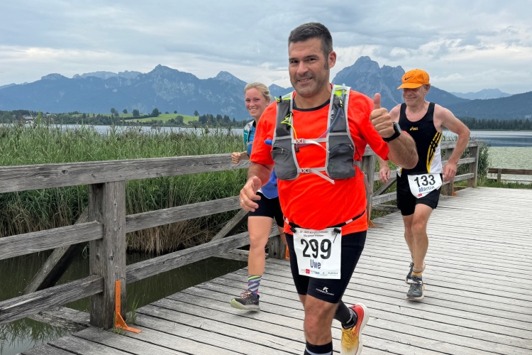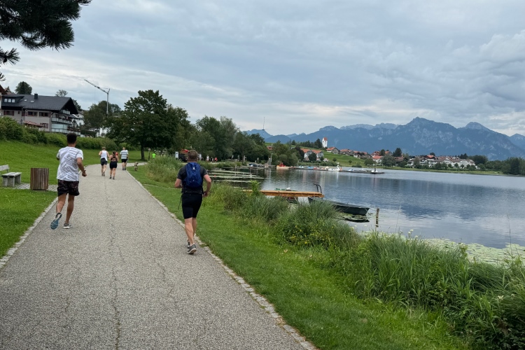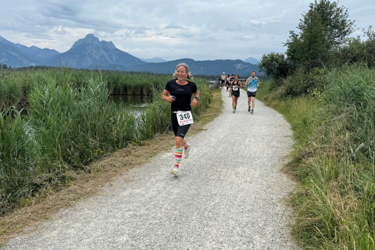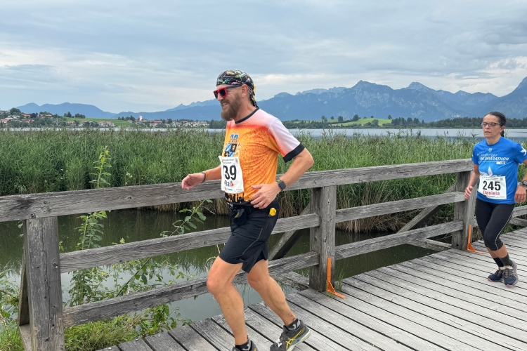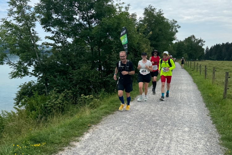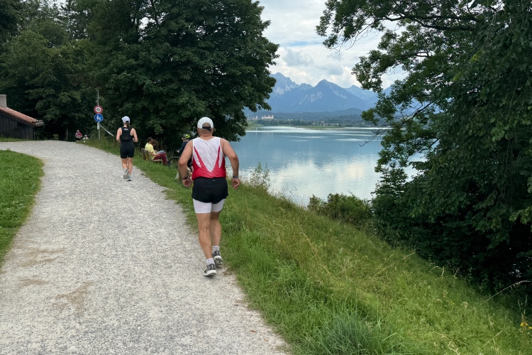Aber für uns geht es kurz vor dem Shoppingareal nach rechts. Wieder ein Kiesweg, aber sehr idyllisch. Kilometer 38, am Schwansee entlang. Endlich ein kleiner Zwischen-VP. Abends werden die Viertel- und Halbmarathonis hier links über den Hügel nach Füssen zurücklaufen. Wir sparen uns die 50 Höhenmeter auf einem Kilometer und laufen an Badebuchten und einem Kiosk vorbei. „Linsencurry“, lese ich laut von einer Angebotstafel ab. „Das käme jetzt genau recht.“ Da müssen die Besucher lachen. Aber das Linsencurry habe ich am Sonntag nach einer kleinen 18-km-Wanderung tatsächlich probiert und kann es nur empfehlen.