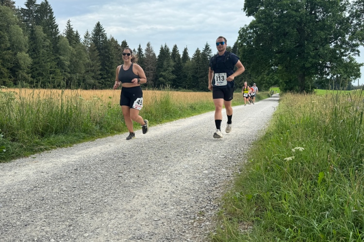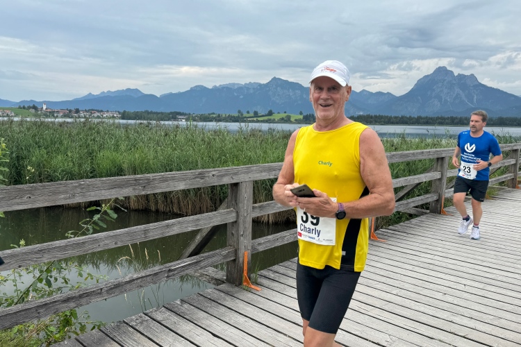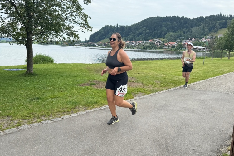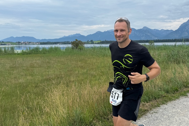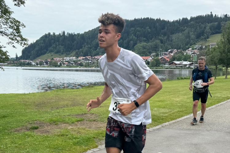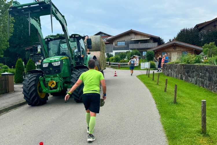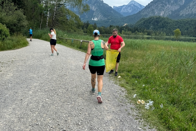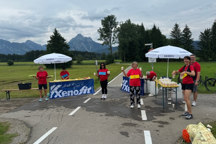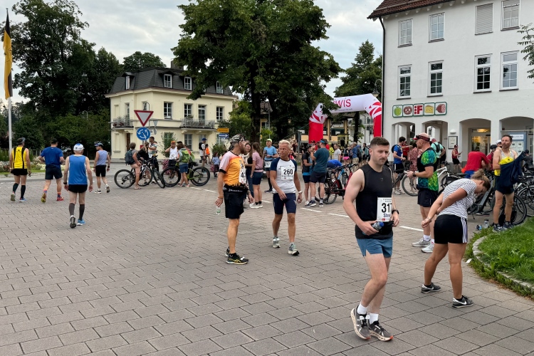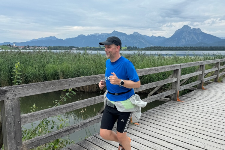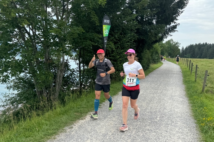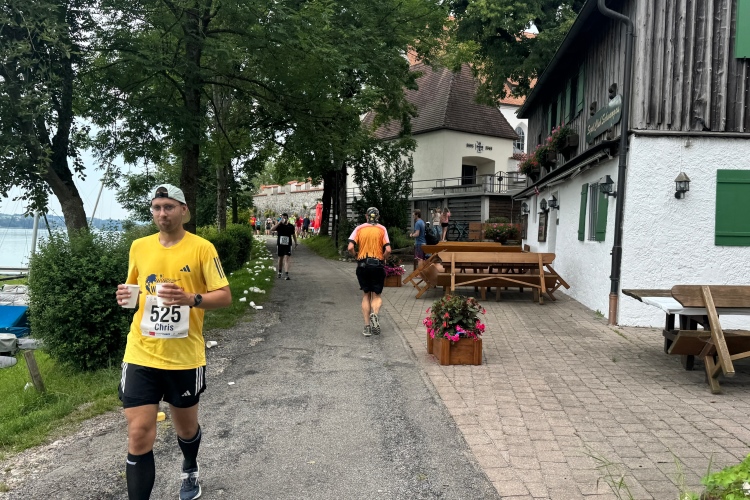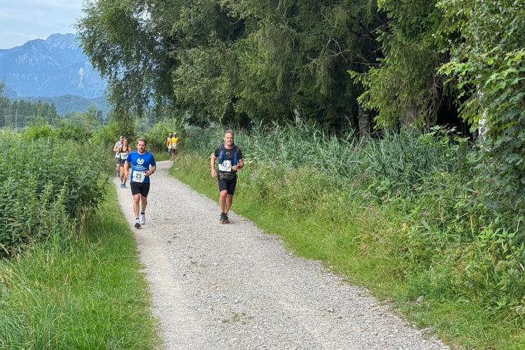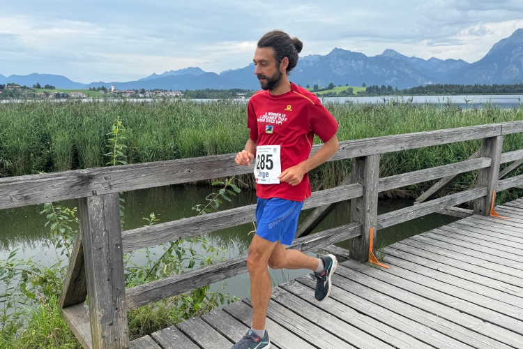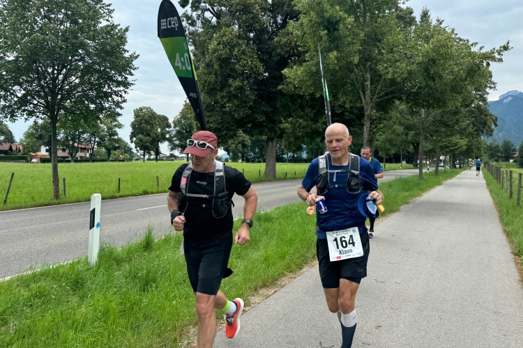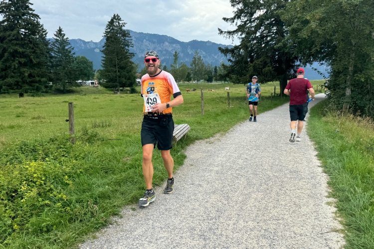 Aber für uns geht es kurz vor dem Shoppingareal nach rechts. Wieder ein Kiesweg, aber sehr idyllisch. Kilometer 38, am Schwansee entlang. Endlich ein kleiner Zwischen-VP. Abends werden die Viertel- und Halbmarathonis hier links über den Hügel nach Füssen zurücklaufen. Wir sparen uns die 50 Höhenmeter auf einem Kilometer und laufen an Badebuchten und einem Kiosk vorbei. „Linsencurry“, lese ich laut von einer Angebotstafel ab. „Das käme jetzt genau recht.“ Da müssen die Besucher lachen. Aber das Linsencurry habe ich am Sonntag nach einer kleinen 18-km-Wanderung tatsächlich probiert und kann es nur empfehlen.