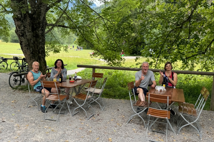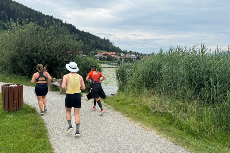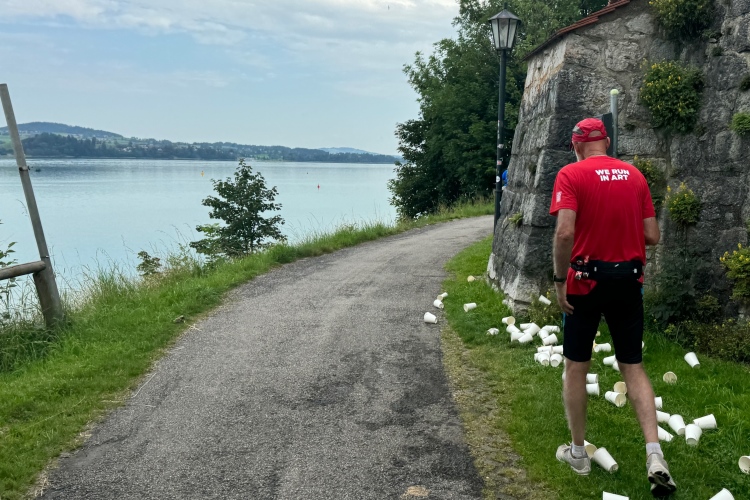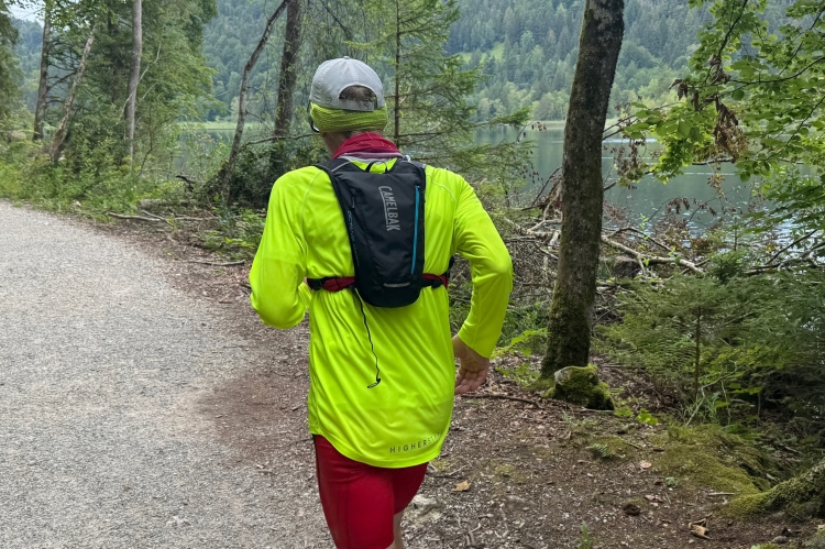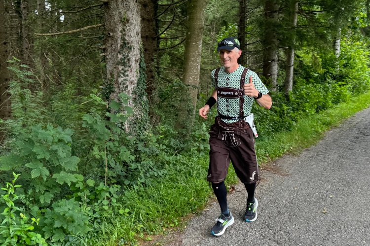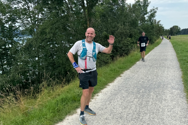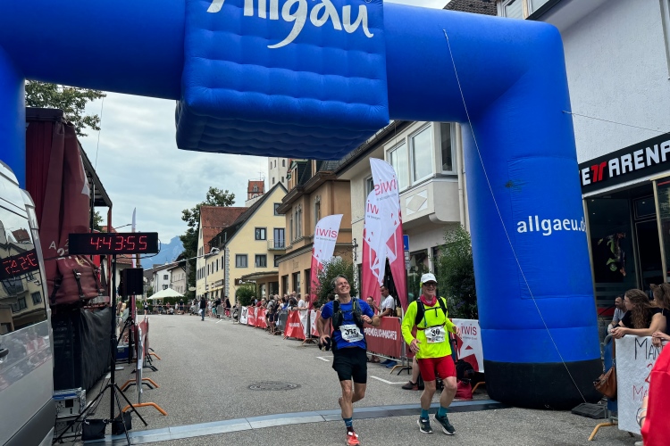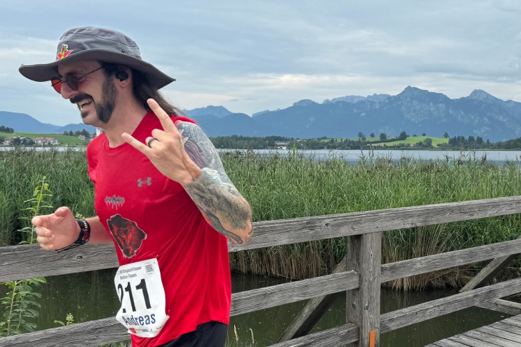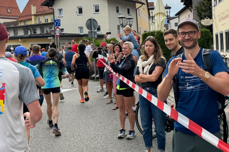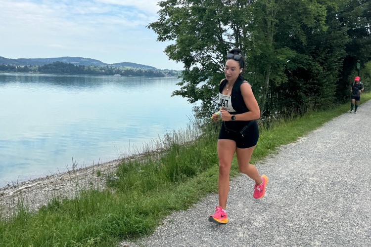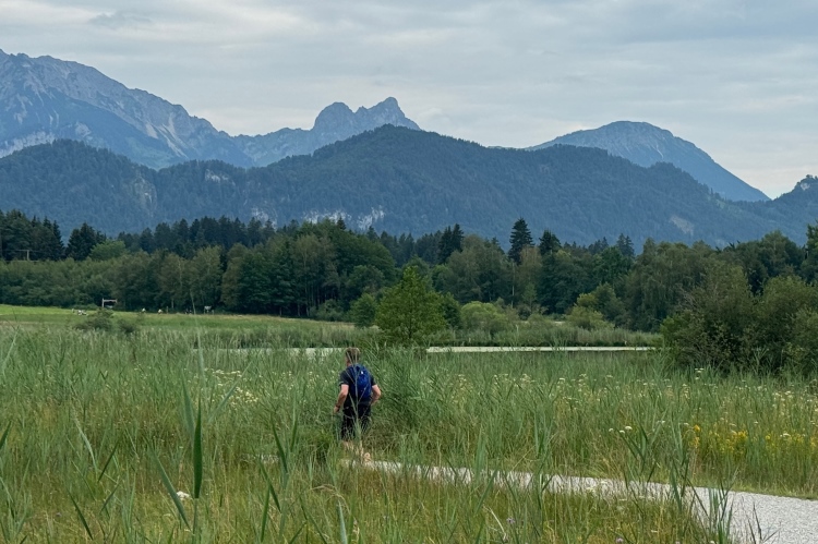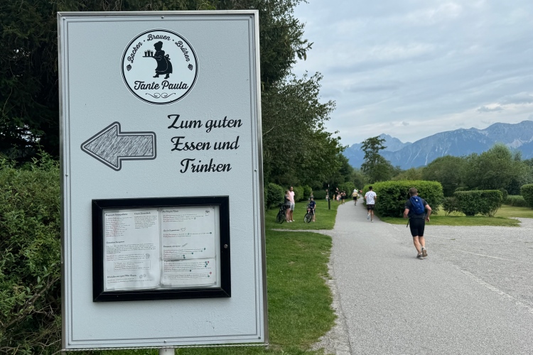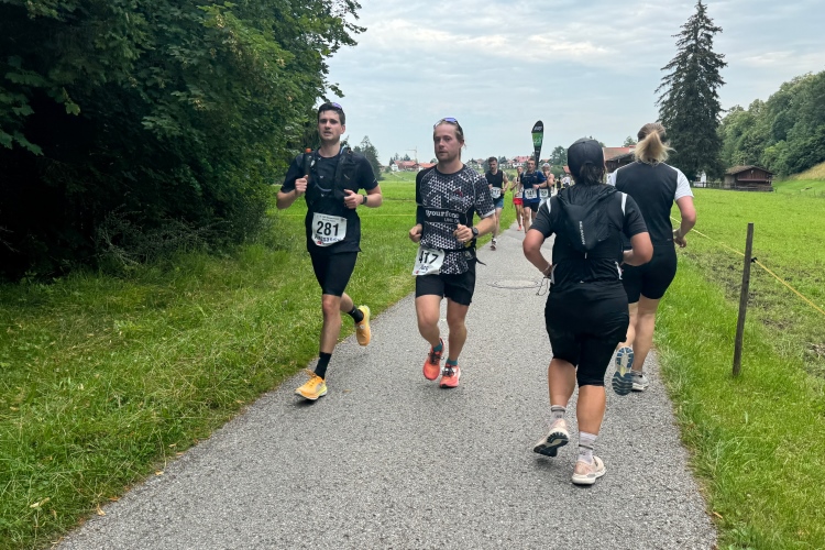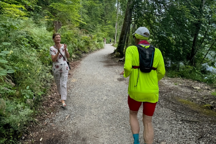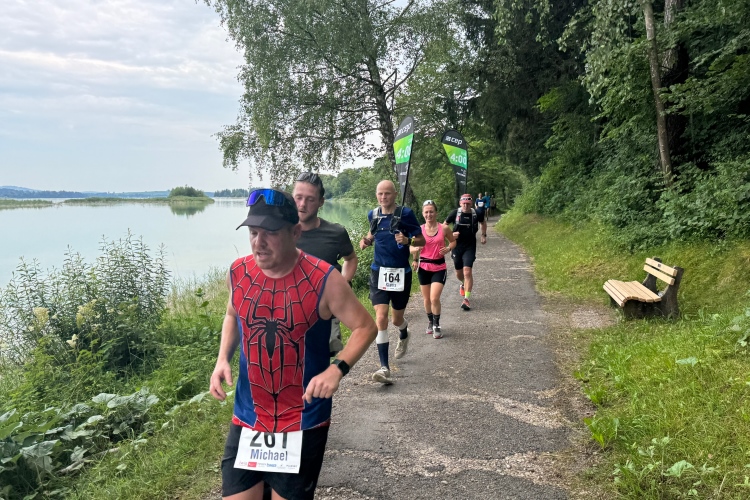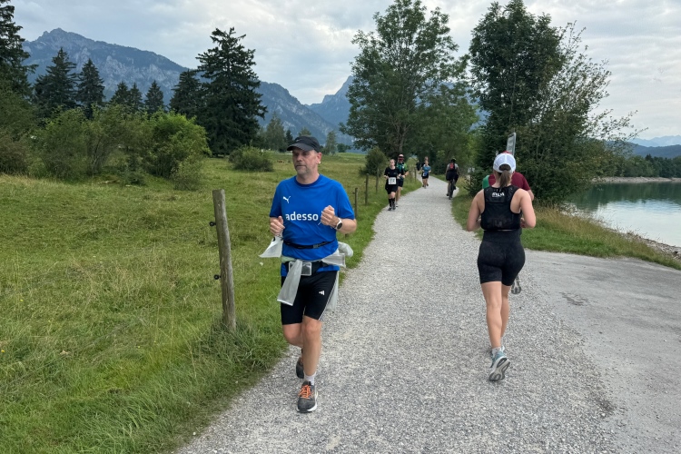 Aber für uns geht es kurz vor dem Shoppingareal nach rechts. Wieder ein Kiesweg, aber sehr idyllisch. Kilometer 38, am Schwansee entlang. Endlich ein kleiner Zwischen-VP. Abends werden die Viertel- und Halbmarathonis hier links über den Hügel nach Füssen zurücklaufen. Wir sparen uns die 50 Höhenmeter auf einem Kilometer und laufen an Badebuchten und einem Kiosk vorbei. „Linsencurry“, lese ich laut von einer Angebotstafel ab. „Das käme jetzt genau recht.“ Da müssen die Besucher lachen. Aber das Linsencurry habe ich am Sonntag nach einer kleinen 18-km-Wanderung tatsächlich probiert und kann es nur empfehlen.