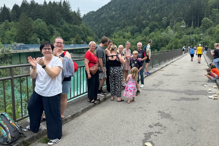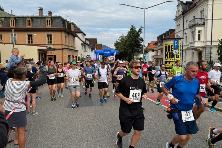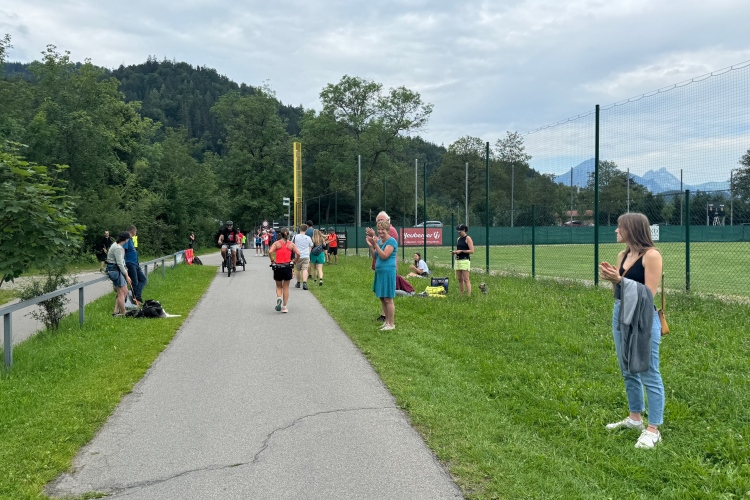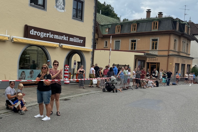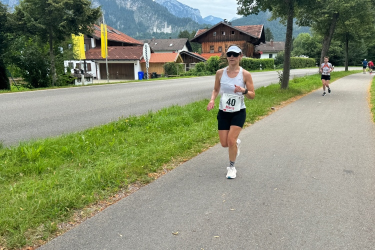 Auffallend wenig Kühe sind heute zu sehen, obwohl doch im Allgäu die Milchwirtschaft einen hohen Stellenwert hat. Die Grasflächen am Wegesrand sind alle verwaist. Die Wendestelle liegt mit einer Verpflegungsstelle zusammen. Dann zurück und wieder der Blick auf Neuschwanstein, ein Schiff und dahinter Ausblicke aufs Festspielhaus und das spätgotische Hohe Schloss samt Kloster St. Mang in Füssen. Die Besenradler kommen entgegen. Im Anhänger liegen die schon wieder eingesammelten Kilometertafeln. Kurz danach noch eine Läuferin. Bei der Wende wird es den Besenradlern wohl auffallen, dass sie da jemanden übersehen haben. Und später zeigt sich, dass die Läuferin es noch in die Ergebnisliste geschafft hat. Über das Wehr zurück und unter der Straßenbrücke hindurch.