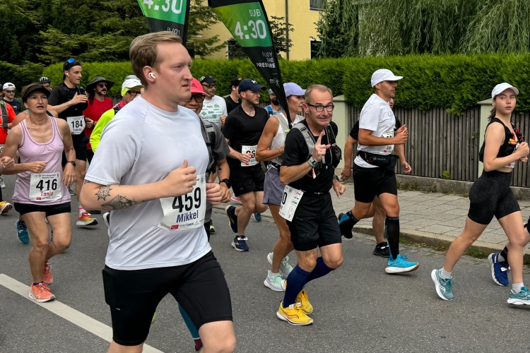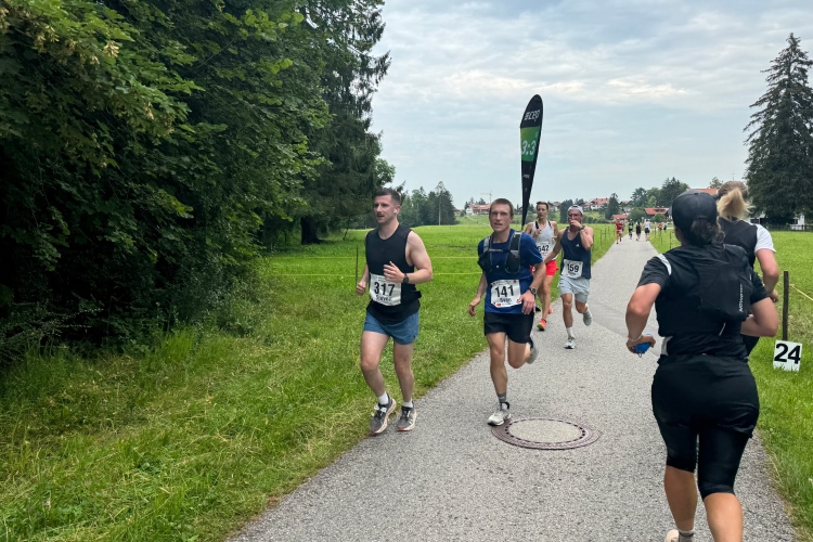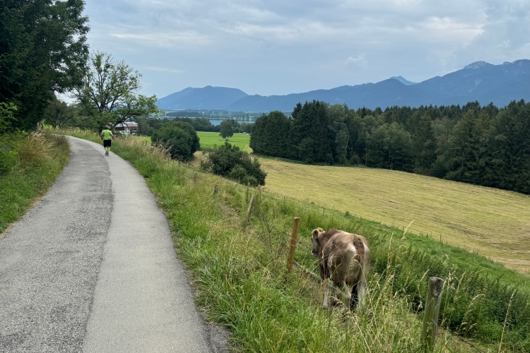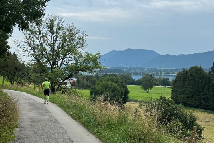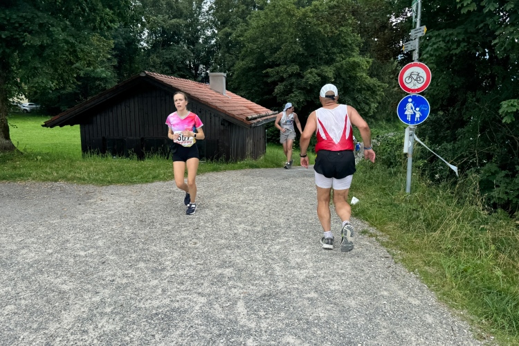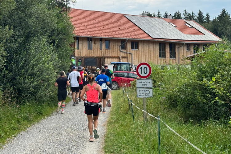 Damit wir den voralpenländischen Charakter des Laufs nicht vergessen, steht bei Kilometer 19 eine kleine Bergwertung an. Nach Unterqueren der Hopfener Straße müssen wir auf ca. einem Kilometer gut 30 Meter nach oben. Auch hier viele Ferienwohnungen. Ich verabschiede mich von Judith. Möchte mal sehen, wie gut ich heute drauf bin und ob ich die 4:30-Pacer wieder einholen kann.
