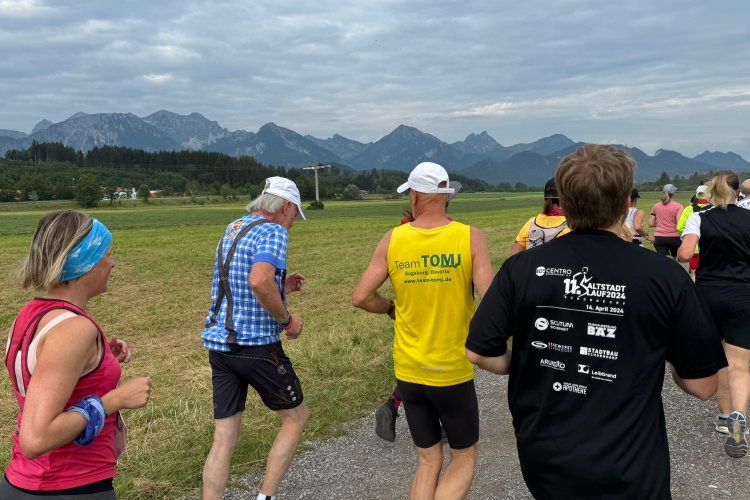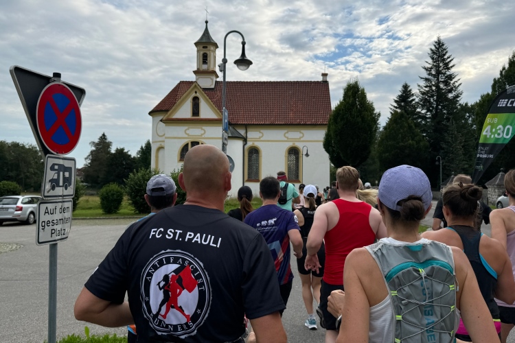 500 Marathonis warten auf den Start. Der erfolgt dann pünktlich um 7:30 Uhr durch einen Schuss. Wir halten uns kurz am Rande der Altstadt. Zuschauende natürlich am Startbereich, dann sind wir schnell auf einem breiten Rad-/Fußweg an der Augsburger Straße B16, aus der Stadt hinaus. Zeit zum Einordnen. Kurz vor Kilometer zwei erreichen wir die Feldkirche St. Ulrich und Afra, die der breiten Bundesstraße wohl etwas zu nahe kam, sodass unser Weg etwas schmaler werden muss. Dann nach links, hier ist auch das Sportstudio, in dem man nachher duschen könnte. Kurz danach werden wir beim Überqueren der B310 mit einem sehr schönen Alpenpanorama empfangen. Eine Läuferin trägt das Hemd vom diesjährigen Madrid-Marathon, das wir auch haben. Sie lässt sich aber nicht ansprechen. Vielleicht hätte ich es auf Spanisch probieren sollen?