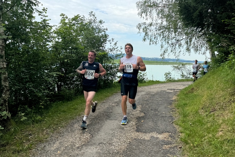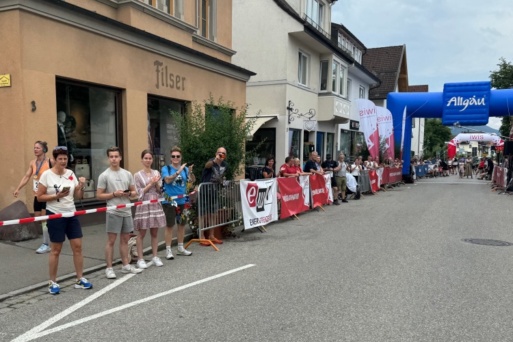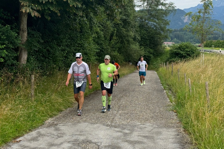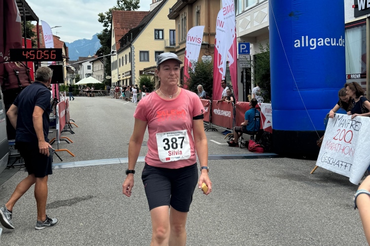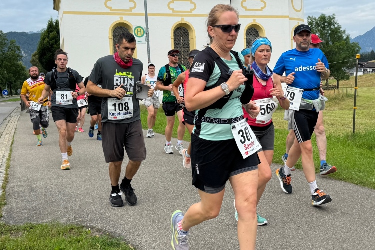Horn ist wieder so eine Idyllische Siedlung am Laufweg. Dort gibt es auch Zuschauerzuspruch und bei km 26 sind wir dann auf dem etwas rustikalen Uferweg am Forgensee entlang. Die Ortschaft Waltenhofen drückt sich dicht an den See; wir passieren Segelklub, Gasthof, Kirche und Bootsanlegestelle. Da werden wir auch ausgiebig angefeuert. Was mir wie ein recht steiler Anstieg erscheint, registriert meine Uhr als läppische zwei Höhenmeter. Noch einen Kilometer bis zur Wendestelle. Ich hoffe die 4:30 Pacer nicht so bald zu sehen. Je später sie mir entgegenkommen, desto eher besteht eine Chance, sie einzuholen. Leider geht es dann doch schneller. Sie sind einen Kilometer vor mir. Das wird wahrscheinlich heute nichts mehr.