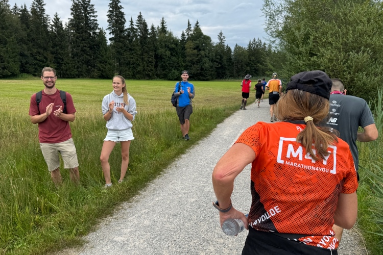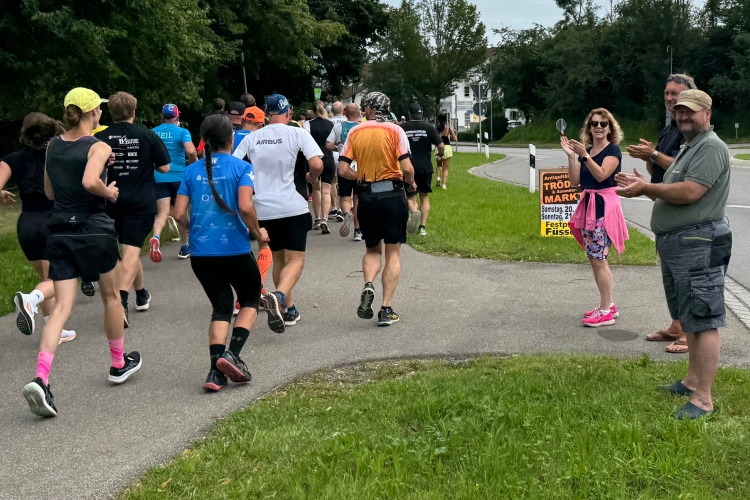 Dann nach links auf einen Schotterweg. In der Gruppe um die 4:30-Pacer wird es etwas eng. Aber noch haben wir die Energie für eine Unterhaltung. Den Pacer Volker kennen wir schon seit vielen Jahren, er läuft auch manchmal unser Tempo, oft aber auch schneller. Heute hoffe ich, mithalten zu können. Erstmalig sehe ich einige Segelflugzeuge am kleinen Flugplatz stehen. Ein Becken auf der linken Seite wird von einigen als Regenüberlaufbecken erkannt. Einige Kurven erwarten uns hier, sodass man das Teilnehmerfeld im Blick behält. An den entscheidenden Abzweigungen stehen Streckenposten. Ich glaube, dass sich trotz einiger Trennstellen niemand verlaufen kann. Am Schorrenmoos geht es bei zwei Eseln vorbei, die wir noch vom letzten Jahr kennen.