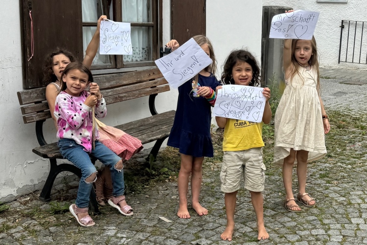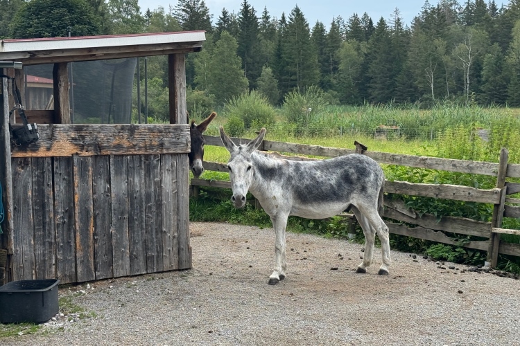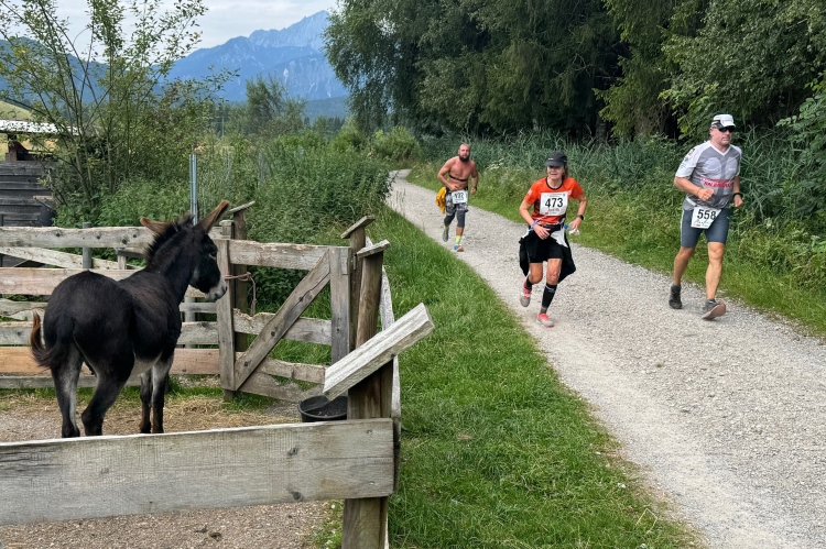 Eine Teilnehmerin macht ein Selfie vor der Kulisse von Schloss Neuschwanstein. Das Foto wird dann gleich gepostet, um die FollowerInnen in Echtzeit am Erlebten teilhaben zu lassen. Obwohl die mehrheitlich in Brasilien wohnen dürften, wo noch tiefste Nacht herrscht. Bei dem einsamen Hof versucht Judith, einen der Esel zu streicheln, doch der weicht ängstlich zurück. Ich schaue mir mal eine der nebenan ausgelegten Zeitungen an: Die weiß von „600.000 schweren Nebenwirkungen durch Corona“ zu berichten. Aha. Womöglich liegt es also an meinen Corona-Infektionen oder gar an den Impfungen, dass ich so langsam geworden bin. Vielleicht ist es aber doch nur das Alter oder die viele lästige Arbeit zwischen den Marathons. Auf jeden Fall wird man auch vor dem Queren des Hofs gewarnt: „Keine Haftung“.