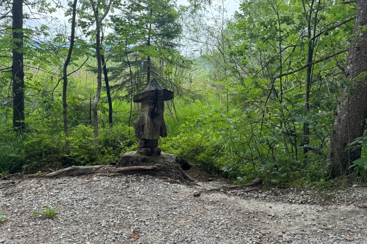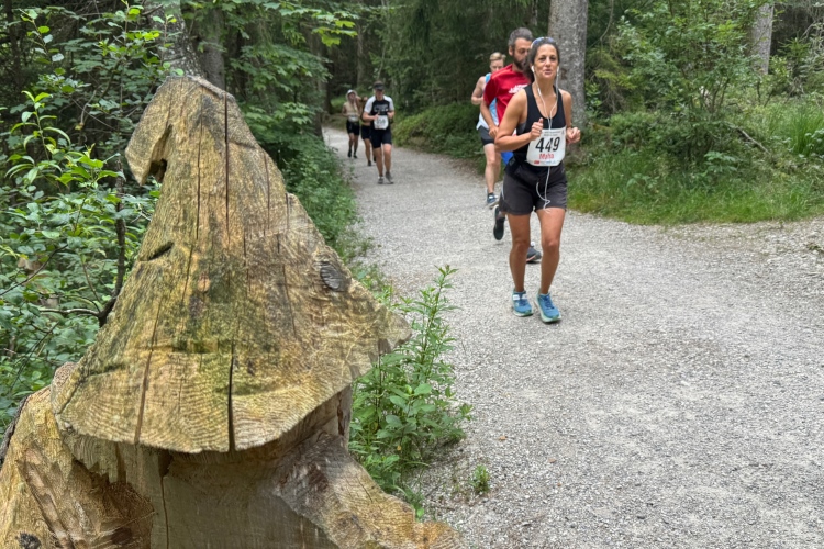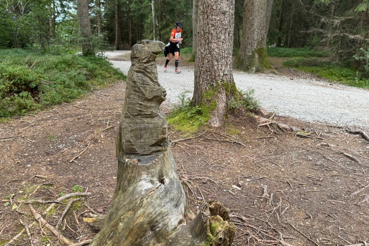 Eine Läuferin und ein Läufer beginnen ein Gespräch und stellen fest, dass sie beide aus Neuseeland kommen. Internationalität wird hier großgeschrieben, was nicht verwundert, da die Königsschlösser im Allgäu als zweitwichtigste Sehenswürdigkeit in Deutschland gelten und Besucher aus aller Welt anziehen. Am Campingplatz vorbei und wieder in das bekannte Wäldchen. Jetzt bleibt Zeit, einige geschnitzte Figuren abzulichten. Trennstelle, diesmal nach links. Dann der bekannte VP an der nächsten Kurve. Es gibt Bananen, gelegentlich auch Energieriegel, Wasser und Iso-Getränke, später Cola. Danke an die Helferinnen und Helfer, die mit Schildern auf ihr jeweiliges „Angebot“ hinweisen.