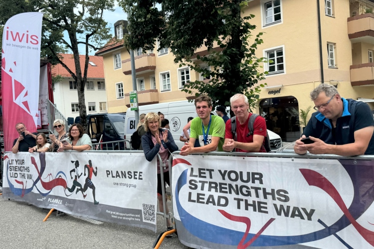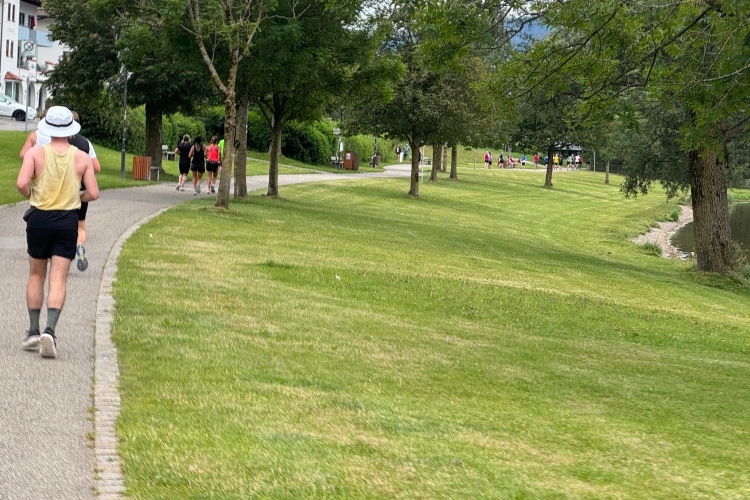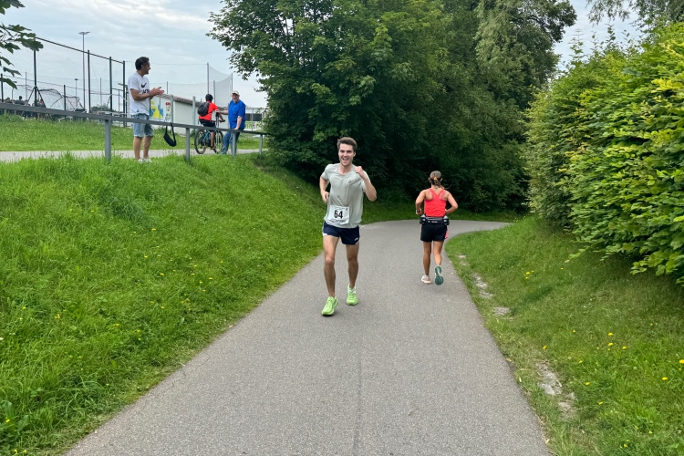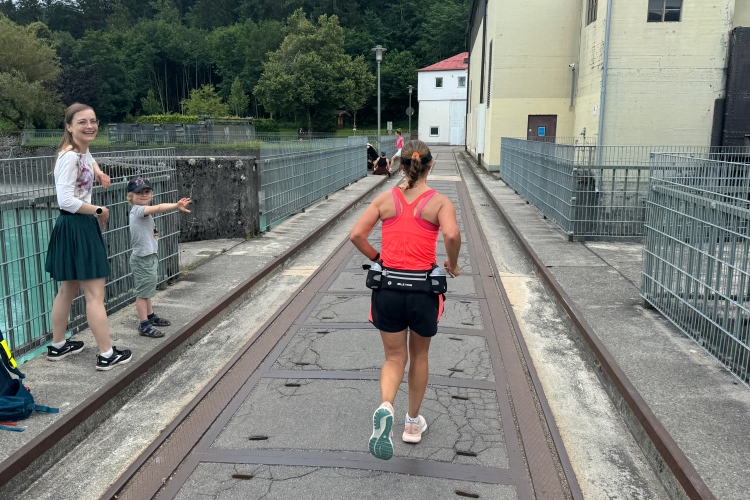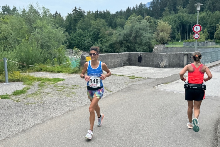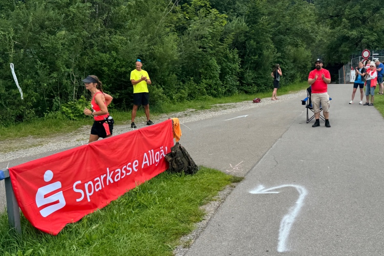 Verpflegungspunkt und dann die Halbmarathonmarke. Zwischen Ortsrand und Lech weiter bis zum Lechwehr. Am Hotel Sommer vorbei. Die dazu passende Sonne hält sich weiter freundlich zurück, aber warm ist es schon. Am Wehr kommen uns die Führenden entgegen. Die an zweiter Position liegende Italienerin Valeria Gasperini lächelt zu mir herüber. Anhand der Kilometertafeln, die heute sehr gut zur GPS-Messung meiner Uhr passen, stelle ich fest, dass wir fast 5 Kilometer bis zur Wendestelle zurücklegen müssen.