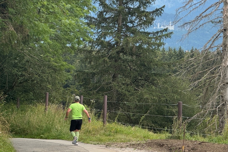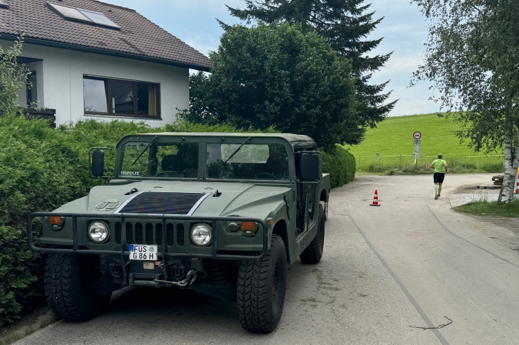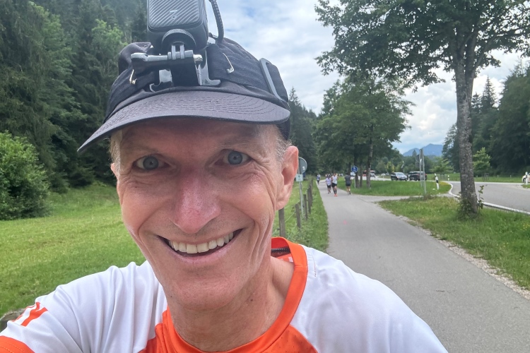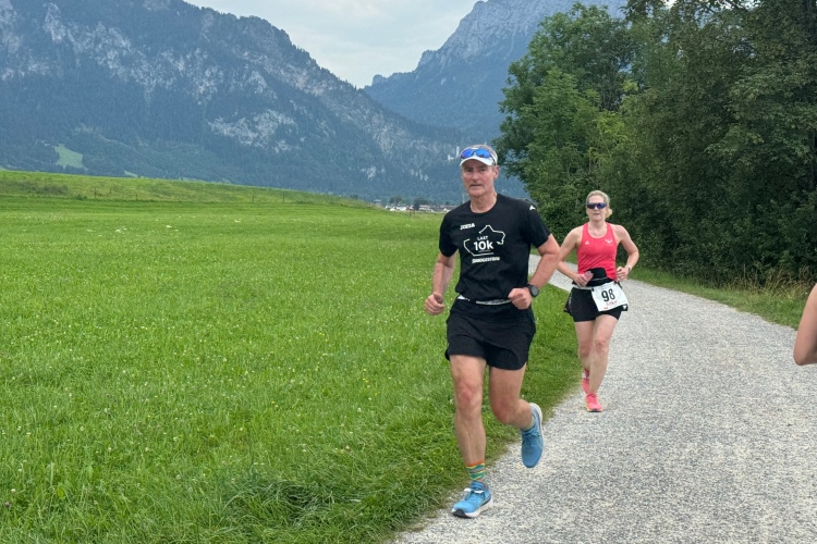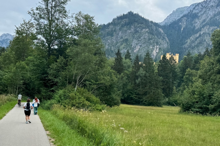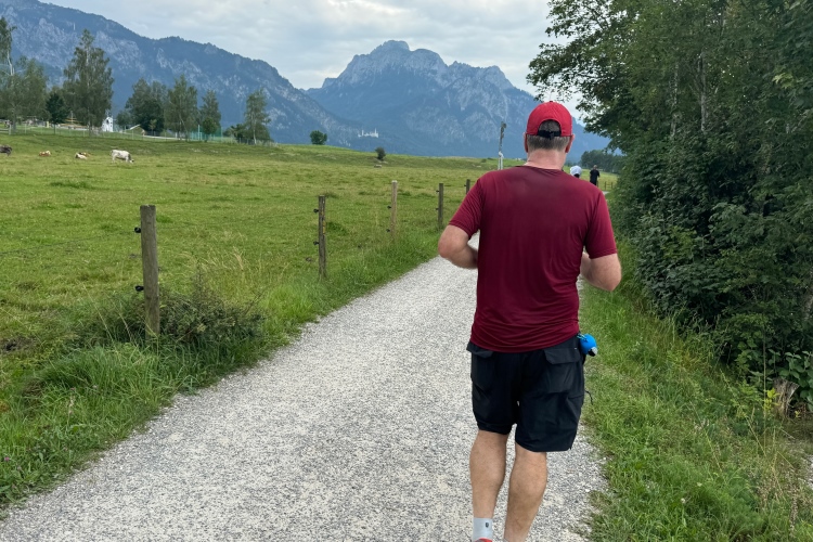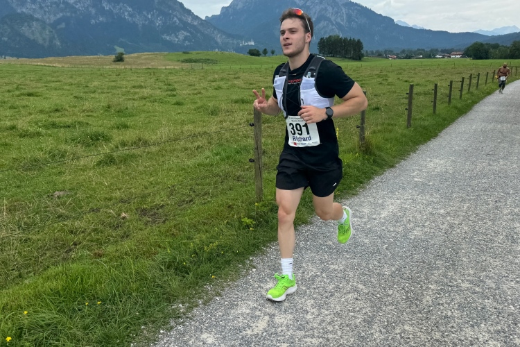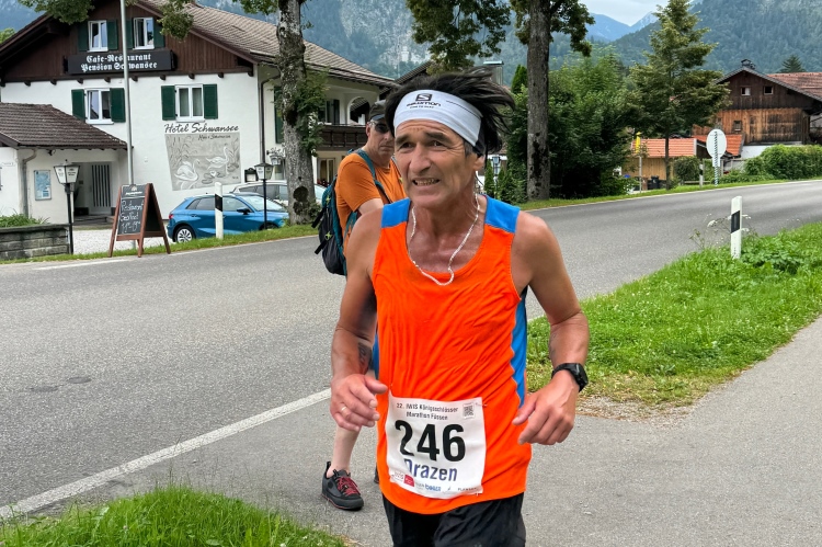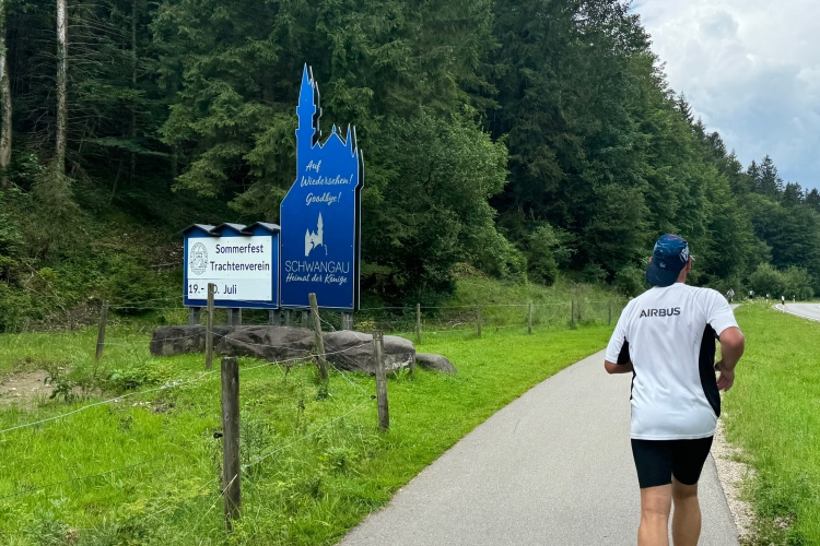 Kilometer 34, das Schlussabenteuer beginnt. Nochmals über den Lech, diesmal auf der Fußgängerbrücke mit sehr vielen Zuschauenden, schließlich entlang der Parkstraße Richtung Hohenschwangau. Erst leicht bergab, dann Trennung von den Entgegenkommenden und nun leicht bergauf. Auf glattem Radwegteer läuft es sich angenehm, fast bis zu den Parkplätzen von Hohenschwangau im Königswinkel. Hier befindet sich der Ausgangspunkt für Besichtigungen der Schlösser Neuschwanstein und Hohenschwangau, welches auch kurz von unserer Laufstrecke aus zu sehen war. König Ludwig II. verbrachte Teile seiner Jugend in diesem älteren Schloss, das sein Vater Maximilian II. anno 1837 im romantischen Stil hatte umbauen lassen. Gemäß dem Zeitgeist wollte er in der Nachbarschaft eine idealisierte mittelalterliche Burg bauen.