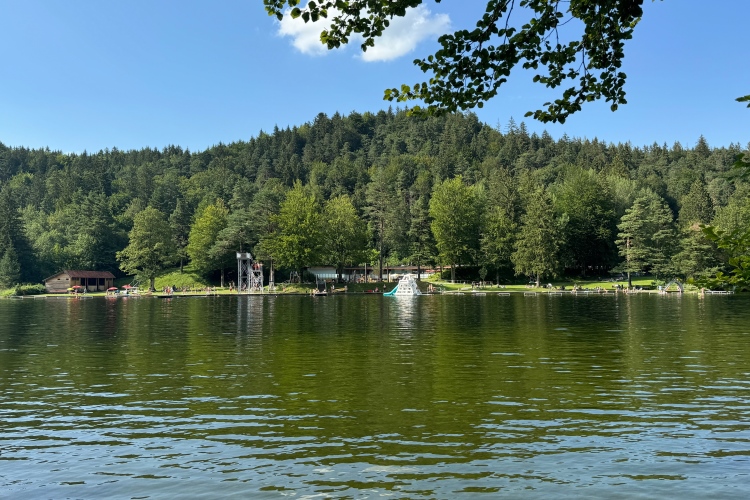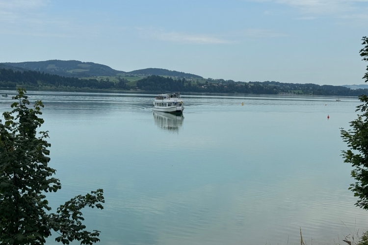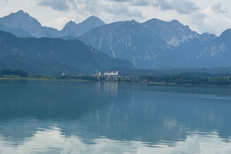 Wir erreichen das Nordufer, verlassen das Gemeindegebiet von Füssen und kommen nach Hopfen am See. Hier kann man viele schöne Unterkünfte sehen. Und der Blick über den See auf die Alpen ist schon wunderbar. Irgendwann muss ich hier auch mal übernachten. Einige Spaziergänger feuern uns an. Im warmen, nur 10 Meter tiefen See sieht man niemanden. Vielleicht schreckt das trübe Wetter etwas ab.