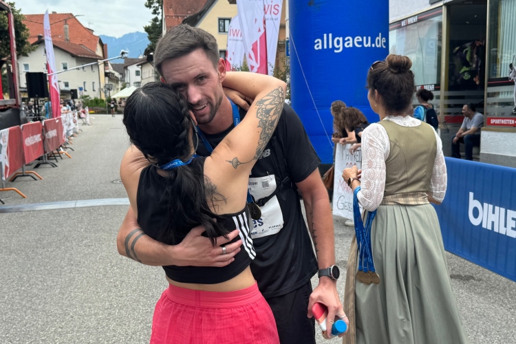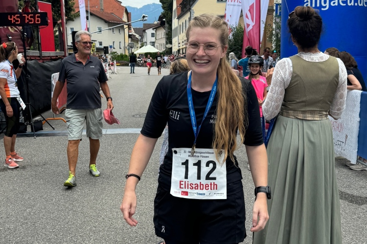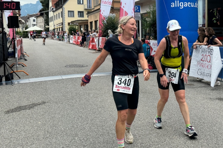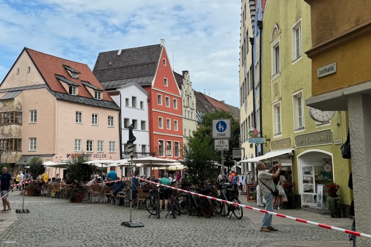 Parkstraße, der große VP am Zusammentreffen der beiden Laufrichtungen. Ich nehme an, Judith ist schon vorbei. Anderthalb Kilometer, die endlos erscheinen. Irgendwie fühlt es sich an, als ginge es leicht bergauf. Unter der Straße nach Österreich hindurch und wieder über die Fußgängerbrücke über den Lech. Letzter VP und diesmal Cola für mich. Hinunter zum Fluss, bald danach noch mal hoch in die Altstadt. Die Flößergasse und dann die Spitalgasse, keine Laufenden vor mir. Die Spitalkirche Heilig Geist, das Hohe Schloss, eine der am besten erhaltenen mittelalterlichen Burganlagen Bayerns, und das ehemalige Benediktinerkloster St. Mang. Noch mal ein paar Meter steil hinauf. Die Kneipenbesucher sind desinteressiert. „Gut seht ihr aus“, rufe ich ihnen zu. Keine Reaktion. In den Cafés am Stadtbrunnen geht es etwas weniger apathisch zu. Der Aperol Spritz scheint verlockend.
