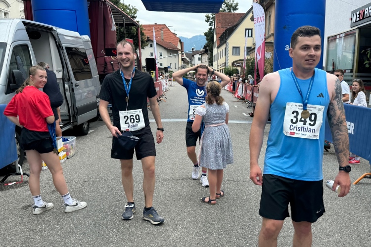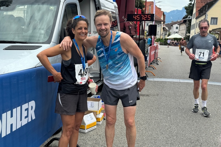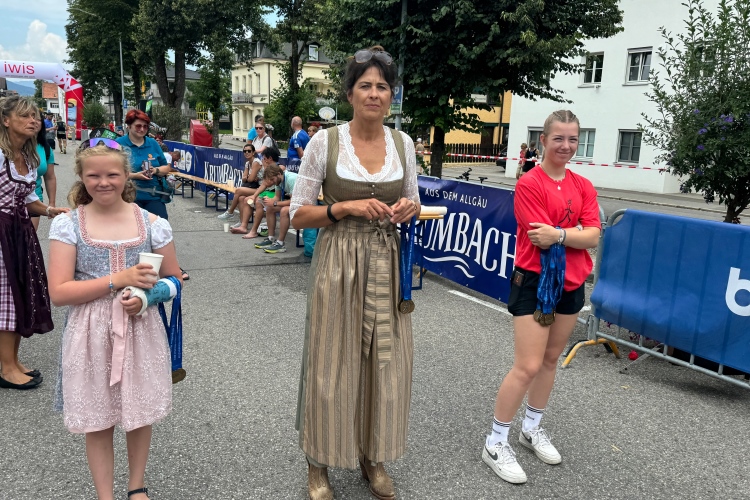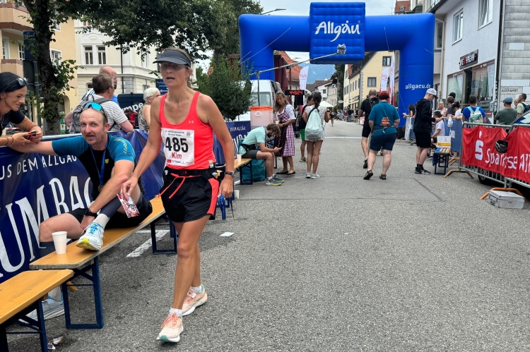 Wir fachsimpeln und bald darauf kommt auch Judith ins Ziel. Ein Stück weiter ist die Zielverpflegung aufgebaut. Natürlich findet das alkoholfreie Bier viel Zuspruch. Im Zelt kann man sich noch einen Teller Pasta abholen.