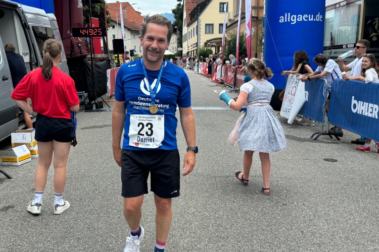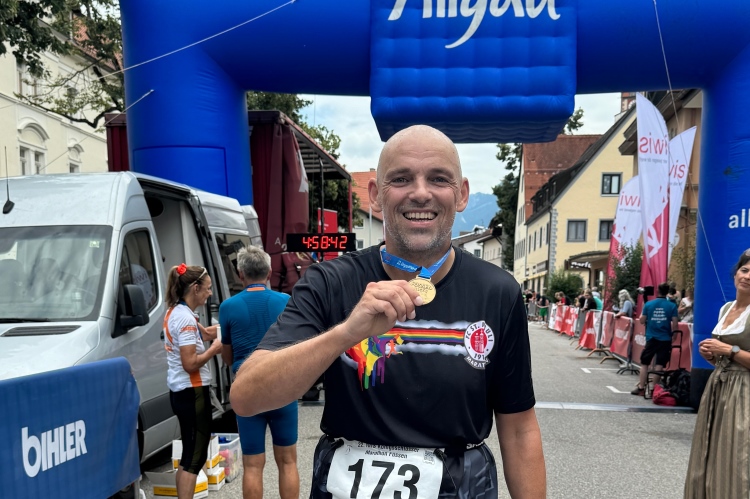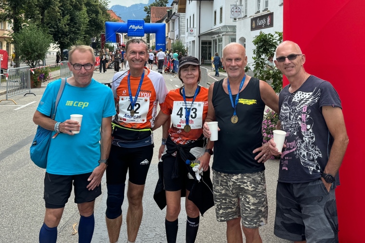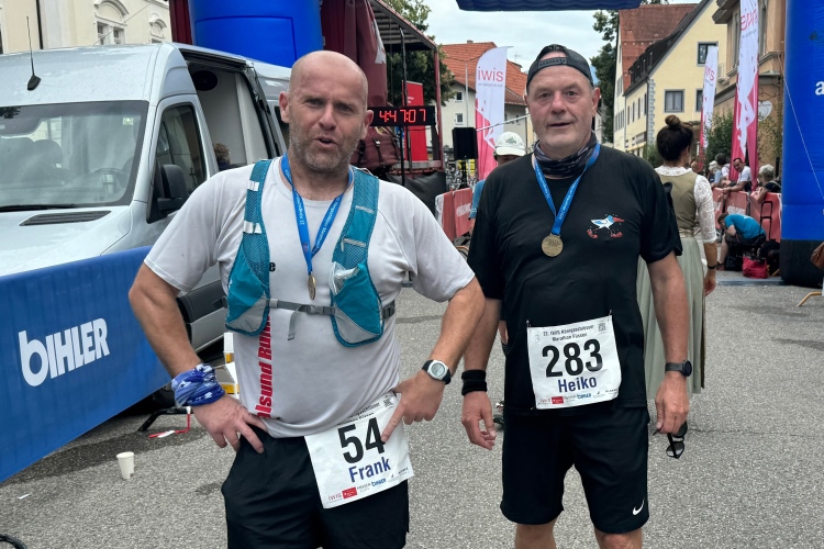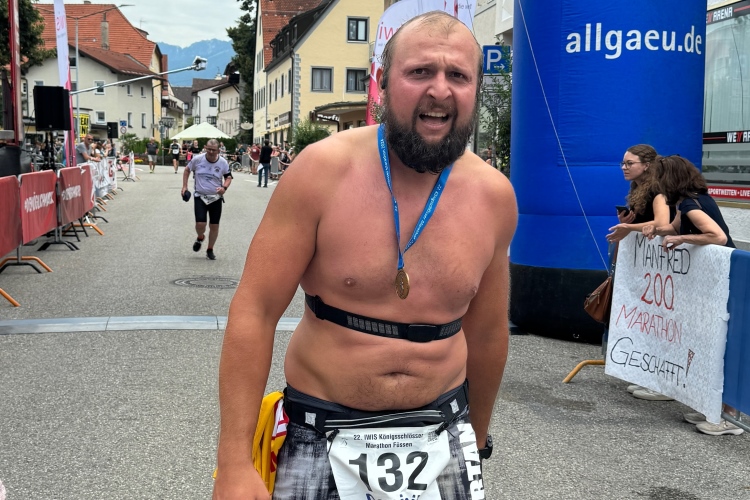 Durch die Ritterstraße die letzten hundert Meter hinunter Richtung Ziel. Nach 4:36 komme ich an, leider habe ich die 4:30 leicht verfehlt. Viele Bekannte empfangen mich hinter dem Zielbogen. Eine junge Dame hängt mir die Medaille um. Die zeigt eine laufende Figur, deren gekröntes Haupt vermuten lässt, dass es sich um den “Kini” handelt. Vielleicht in einer sportlich aktiven Phase, bevor er sich aufs Schlösserbauen verlegte? Nix Genaues weiß man nicht. Die Viertelmarathonis bekommen jedenfalls später eine goldene Medaille.