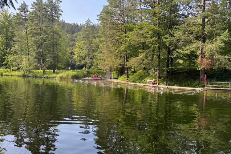 Hinunter zum Forggensee. Ein Stausee des Lechs, der fünftgrößte See Bayerns. Den Staudamm könnte ich mir auch mal in Echt ansehen. Schöne Ausblicke auf das Gewässer und ein Kirchlein. Links davon ein Wäldchen, dort müssen wir hin. Aber zuerst einmal zum Festspielhaus. Zwischen 1998 und 2000 erbaut, war es ursprünglich gedacht als am Originalschauplatz gelegener Aufführungsort für ein Musical über den „Märchenkönig“ und Neuschwanstein-Bauherr Ludwig II. Seit 2007 wird es als Bespieltheater an kommerzielle Veranstalter vermietet. Gestern gastierte hier die Berliner Country-Band The BossHoss.