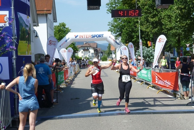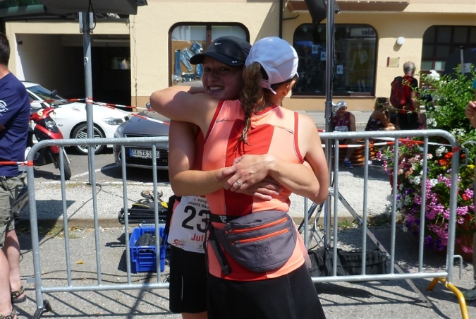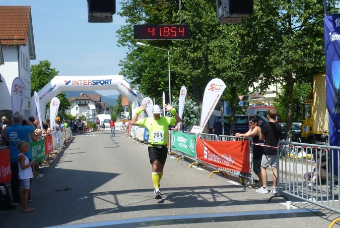 Und immer noch ist alles gut, unser Vorsprung auf zweieinhalb Minuten angewachsen, kein Anlaß zur Beunruhigung also. Nach km 40 haben wir wieder die Füssener Stadtgrenze erreicht. Den Lech über einen festen Steg überquerend, zeigt uns das tolle Panorama von Stadtmauer, Hohem Schloß und darunterliegendem Kloster St. Mang, daß sich das Ziel in Riesenschritten nähert. Die letzte Verpflegung lasse ich aus, denn was ich jetzt einwerfe, kommt eh nicht mehr an und wirkt nur als Placebo, das ich erfreulicherweise nicht brauche. Klar auf Sub 4 Stunden-Kurs erklimme ich den Weg in die hochgelegene Altstadt. Selbst diese späten Höhenmeter nehme ich locker, es geht doch nichts über eine gute Motivation, gepaart mit genügend Kraft in den Beinen. Km 41, 42, viel Vorsprung, sagt Magic. Ich lasse mir Zeit, genieße die letzten Meter durch die Morisse, höre schon den Zieltrubel, schieße noch etliche Fotos und bin ganz auf den Zieleinlauf konzentriert. Magic und seine letzte verbliebene Begleiterin stürmen voran, ich lasse sie ziehen, denn ich habe ja Zeit. Und dann passiert etwas, das ich noch nie erlebt habe und hoffentlich auch nie wieder erleben werde.