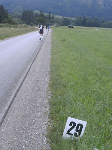 Wir queren den Lech, der hier in und durch den Forggen-See mündet bzw. fließt, und schon ist Halbzeit. Irgendwie ging es trotz oder vielleicht wegen des Regens ziemlich rasch heute. Zwar gibt es nur vereinzelt Zuschauer, aber der Lauf hat dennoch eine gute Stimmung. Wir werden mit Kuhglocken, Trompeten u.a.m. angefeuert und wer gerade auf der Strecke wandert, feuert uns an.