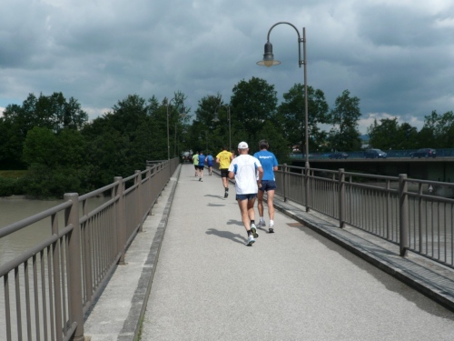 Unser Kurs tangiert kurt Alterschrofen und dann überqueren wir bereits im Stadtgebiet von Füssen den Lech und schließlich laufen wir unterhalb der Altstadt dem Fluss entlang. „Mit dem Tempo könnten wir gewinnen“, so spricht Rüdiger Dittmann aus Kempten. „Zwar nicht hier, aber beim Deutschlandlauf .“ Heute ist es für ihn eine Trainingseinheit für den langen Etappenlauf im Herbst.