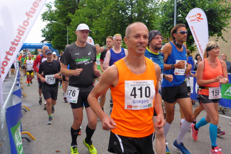 Startnummer 1 hat Marco Diehl, ein bemerkenswerter Marathonläufer. Bei seinen über 100 Marathons landete er meistens auf dem Treppchen, eine rekordverdächtige Anzahl hat er gewonnen. Der IT-Direktor hat eine ganze Gruppe aus seiner Firma mitgebracht. Weil er nicht zum ersten Mal hier ist und auch diesen Lauf schon gewinnen konnte, ist er der ideale Ratgeber: „Die Strecke ist wellig, das darf man nicht unterschätzen.“ Dann erfolgt pünktlich der Startschuss und die über 500 Läufer setzten sich in Bewegung.