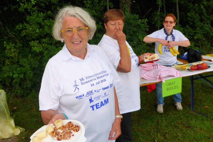 In Laufrichtung erblicke ich die Pfarrkirche St. Maria und Florian von Waltenhofen-Schwangau. Um dorthin zu gelangen, geht es nun ca. 2 km am See entlang. Hinter der imposanten Kirche sind direkt am Seeufer die Helfer der VP am Werk. Appetitlich werden Banane, Apfel und Müsliriegel angeboten. Auf der folgenden kleinen Rampe habe ich genug Zeit zum Essen und Trinken. Oben angekommen, hat man, wenn man sich einmal umdreht, einen herrlichen Blick auf Füssen und Schloss Neuschwanstein.