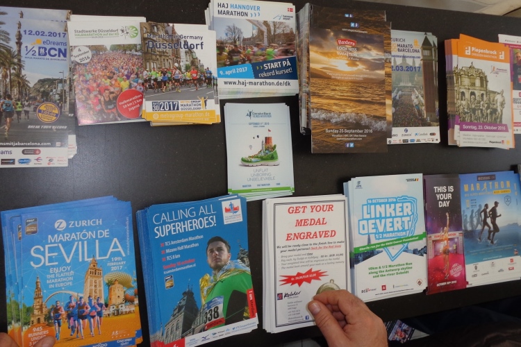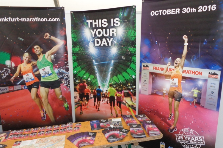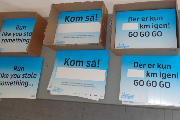 Mit Zurufen ist man sparsam hier, applaudiert wird eher und Schilder werden in die Höhe gehalten. Die konnte man sich von der Marathonmesse mitnehmen.