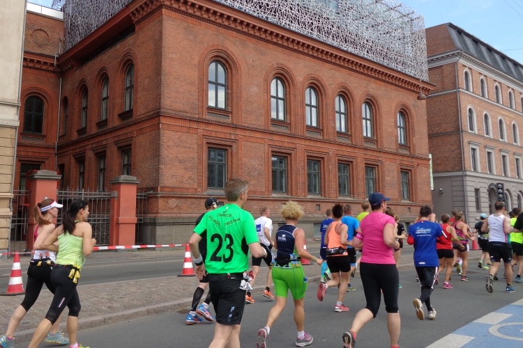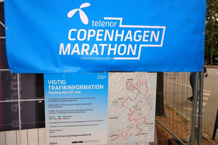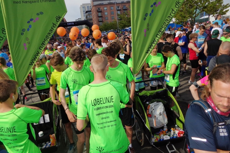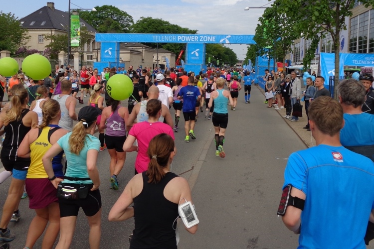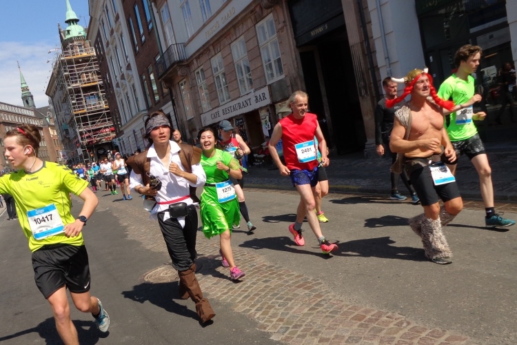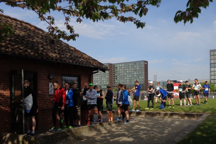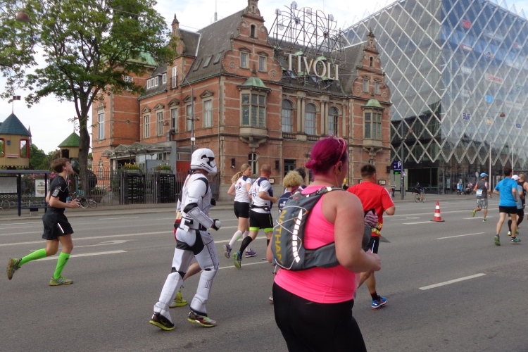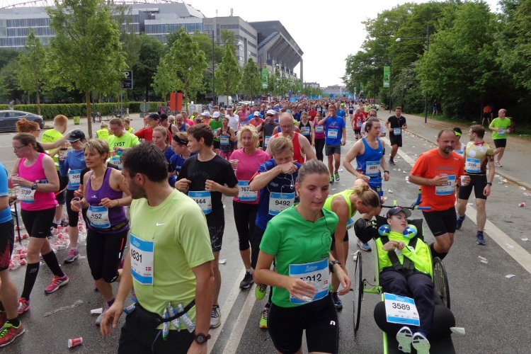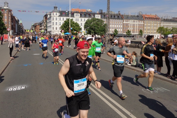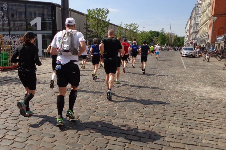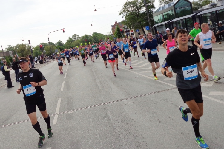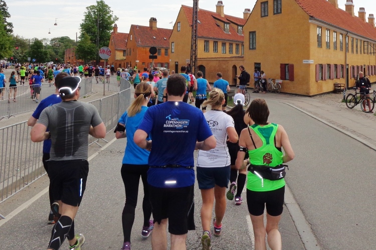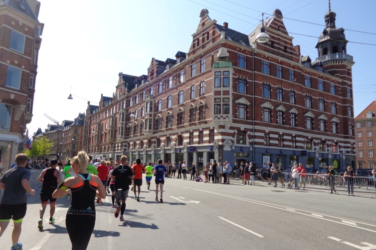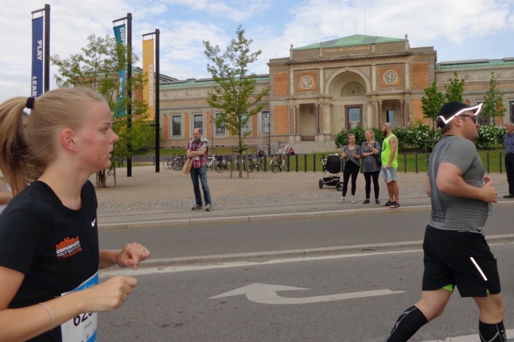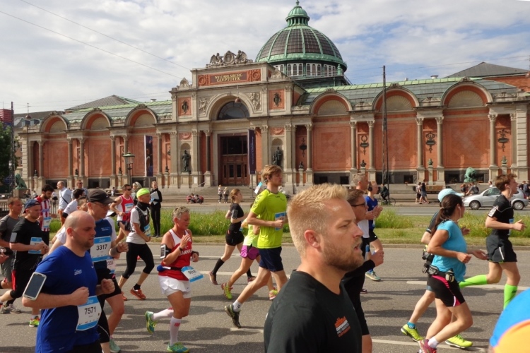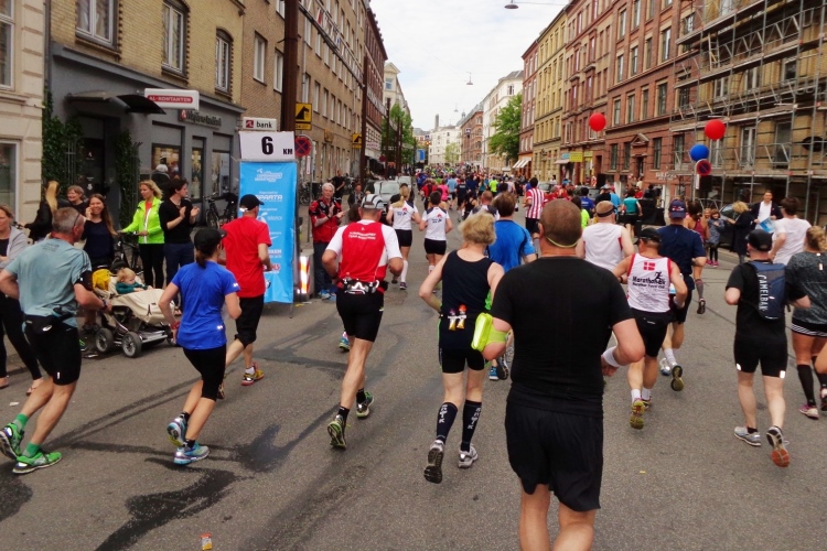 Leicht erhöht steht links das Staatsmuseum, rechts die Zentrale der Dänischen Staatsbahn, gefolgt von einer stattlichen Anzahl gelber Reihenhäuser, ehemals Unterkünfte für Marineangehörige, heute eine begehrte Wohngegend. Nach einem Linksknick beim Oslo-Bahnhof geht es über die Eisenbahn. Runter, rechts in die Kristianiagade. Bei km5 die ersten Zwischenzeit und zuvor die erste Labestelle. Dort ist man hoffnungslos überfordert, es hat sich ein Stau gebildet. Ich trinke aus meiner Flasche, diese Labestelle lasse ich besser aus.