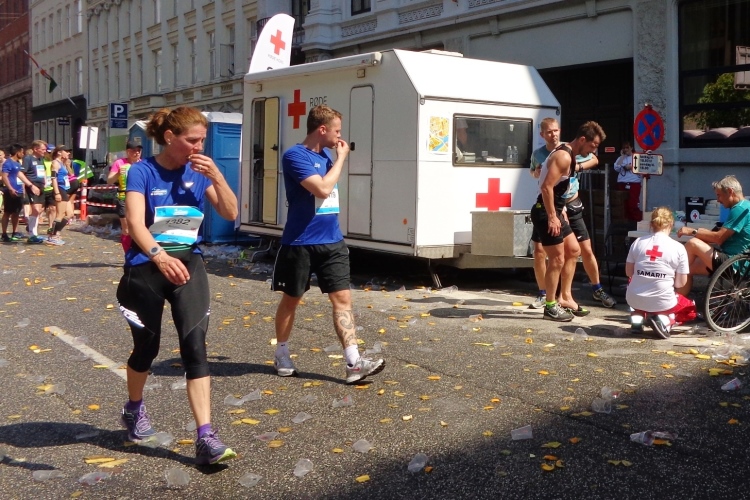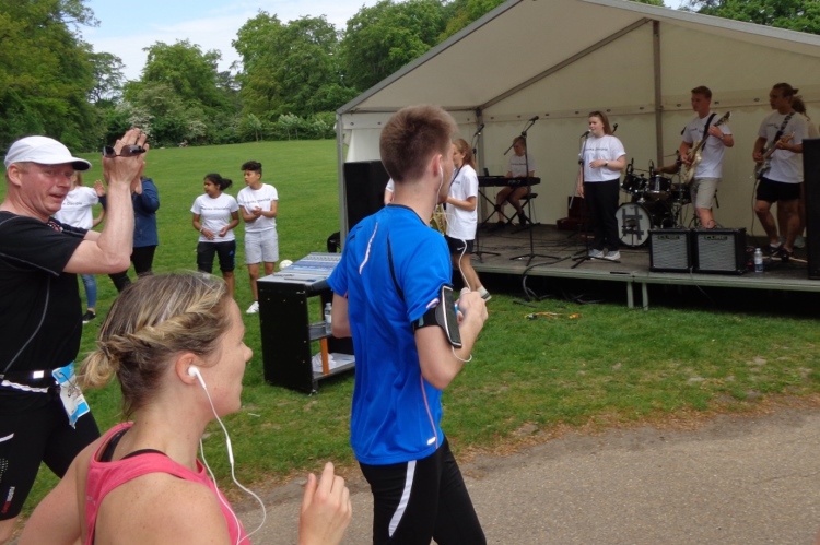 Durch den Park, Wiesen und Bäume, erst ein DJ, dann eine Hard-Rock Band auf einem Sattelaufleger, wenig später eine Schülerband – gar nicht schlecht! Wieder einmal werde ich von Läufern überholt, die eine behinderte Person vor sich herschieben. „Denn Sport ist für alle!“ steht auf ihren Shirts. Diese Läufer geben ihren Schützlingen auch zu trinken und wechseln sich ab. Die Sonne kommt raus.