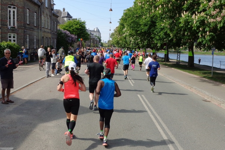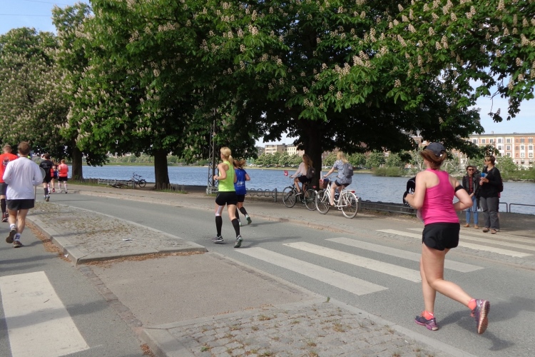 Vor km11 wandelt sich das Bild: Die Øster Søgade wird links von einstöckigen Häusern gesäumt, rechts von einer langen Reihe blühender Kastanienbäume am Ufer eines Sees, am Ufer vis-à-vis von der Sonne bestrahlte Häuserfassaden. Es sieht hier sehr nach Hamburg aus. Im Schatten der Bäume lagern Zuseher und feuern uns sitzend an: „Hep, Hep, Hep!“ Einmal ein „Heja“, das war gewiss eine Schwedin.