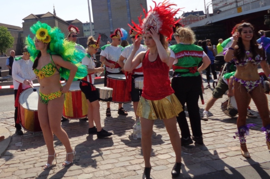 Da sind die Sambatänzerinnen wieder. Die haben Glück, mit Sonnenschein bei etwa 25° herrscht perfektes Sambawetter. Nyhavn, malerische Ausgehmeile der Stadt mit den farbenfrohen Häusern, Hans Christian Andersen kam hier zur Welt. Im Hafenbecken schwimmen Kutter, Segelschiffe und Ausflugsboote.
