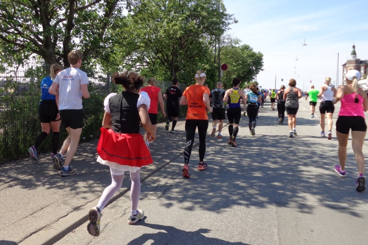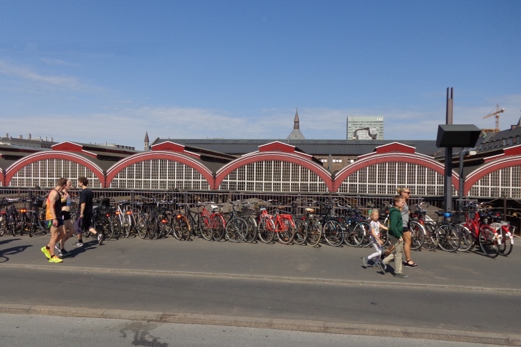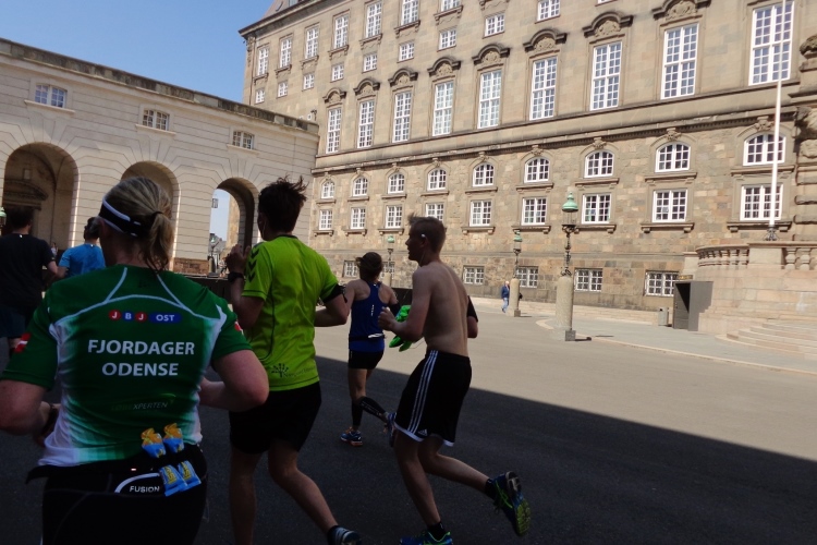 Sieh’ da, Sambatänzerinnen! Es geht unter einer Brücke durch, dann sind wir an der Börse und damit auf der Schlossinsel. Es geht durch den Hof von Schloss Christianborg, darin ist u.a. das dänische Parlament untergebracht. Es geht über den Canal, km17, hinter der Glyptothek am Tivoli vorbei und auch am Hauptbahnhof. Ein langgezogener Anstieg mit geringer Steigung. Die Straße beschreibt einen weiten Bogen. Wer links außen läuft, hat stellenweise Schatten. Innen ist es kürzer, dafür aber sonnig. Fast alle laufen außen.