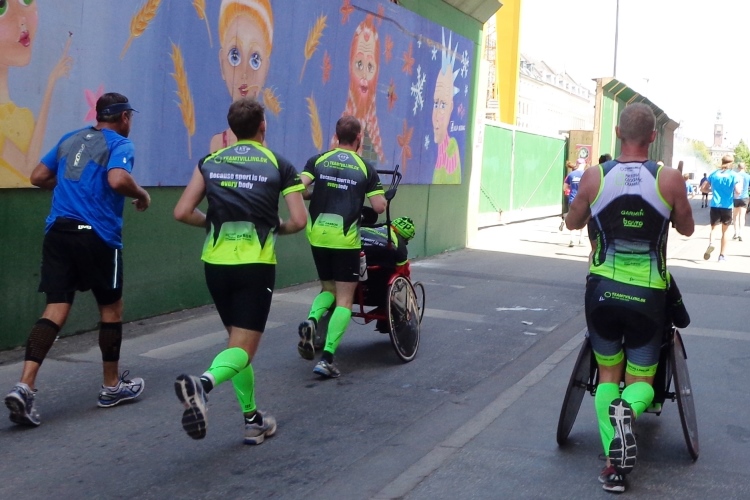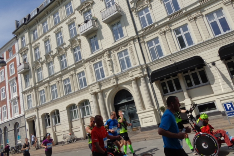 Leider gibt es dann den Israel Plads, wo es recht geschäftig ist. Dieses Straßenpflaster dort mit gewölbter Oberseite und fingerdicken Fugen mag ich überhaupt nicht. Wenn ich mir die anderen ansehe, wie sie da drübereiern, fühle ich mich in guter Gesellschaft. Gut für uns, dass es während des gesamten Marathons in Summe nur ein paar 100m sind mit so einem Straßenbelag. Eine Blasmusikkapelle in alpenländischer Tracht, die „Heidis und Hosen“ geben gerade „Country road, take me home“ zum Besten.