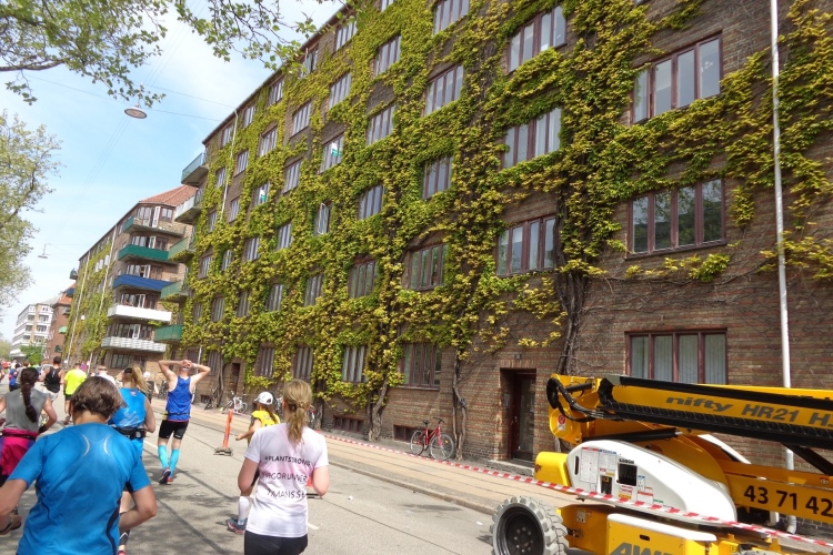 Nun haben wir rechts den Wehrgraben vom Kastellet, alle suchen den Schatten auf, die Fahrbahn liegt in der Sonne. Man kann die Flügelspitzen der Windmühle erkennen, am Oslo Plads waren wir heute schon einmal. Es geht rechts die Folke Bernadottes Allee hinunter und in einem Linksbogen auf eine Fussgeherbrücke über die Eisenbahn. Km28, ein Dudelsackpfeifer sorgt für Abwechslung. Besonders schön ist die mit Wein bewachsene Fassade eines 5-stöckigen Hauses bei der nächsten Labe. Ich fülle meine Getränkeflasche auf.