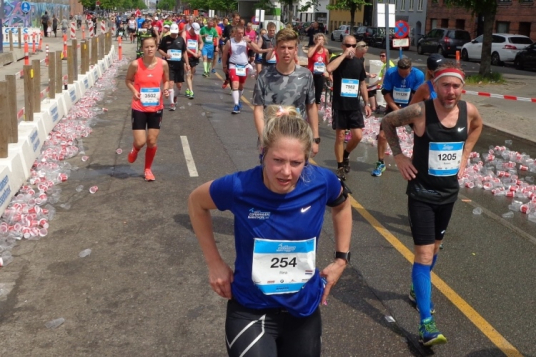 Dann tangieren wir für ein paar Schritte den Højbro Plads mit der Reiterstatue des Bischof Absalon. Hier wieder dieses furchtbare Straßenpflaster, aber eh nur ganz kurz. Es geht auf das Königliche Theater zu, dort rechts runter an einer stehenden Autokolonne entlang. An der nächsten Labestelle gibt es neben Wasser und High5 wieder Obst. Der Boden ist schon recht rutschig von den vielen Schalen der Orangen und Bananen. 7.700 Läufer waren heute schon vor mir hier, da fällt natürlich einiges an Abfall an.