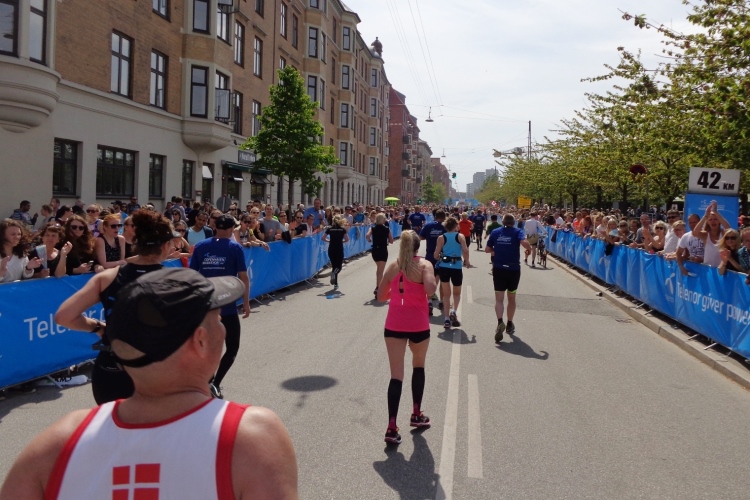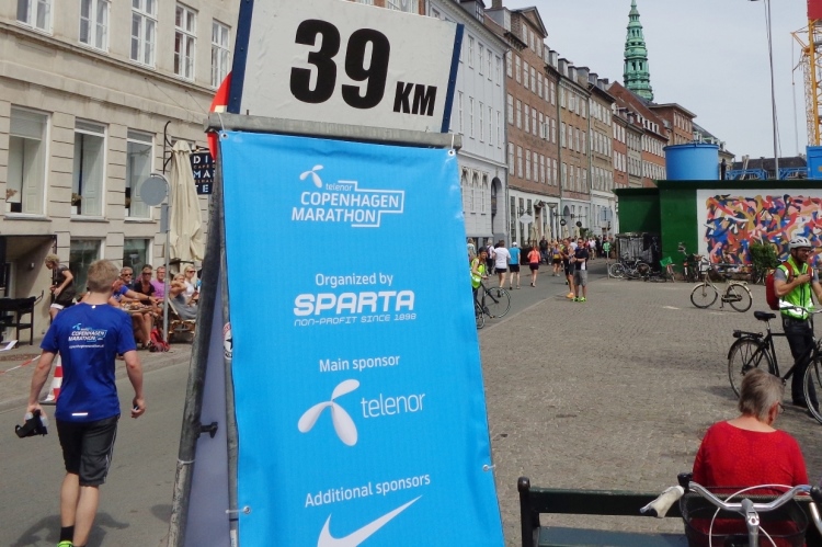 Abermals beim Østerbro Stadion, Zuseher haben die Initiative ergriffen und teilen Wasserflaschen aus. Diese finden reißenden Absatz. Die nächste Labe ist aber schon vor km32. Dort höre ich von einem jungen Mädchen dauernd leise ”Shit, shit, shit”. Es ist ihr erster Marathon und sie wollte eigentlich viel schneller sein. Ich kann sie überzeugen, dass das heute gewiss kein Tag für eine schnelle Zeit ist. Es wird andere Tage geben, da klappt es dann. Noch 10km.