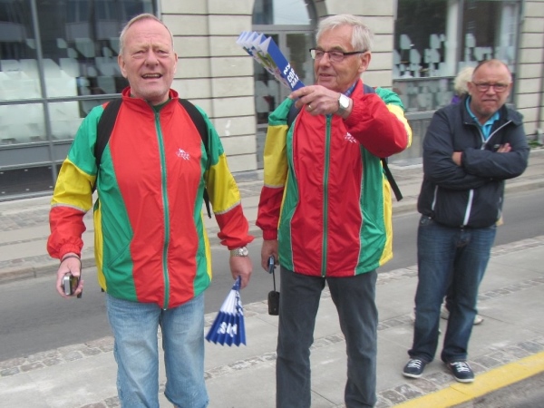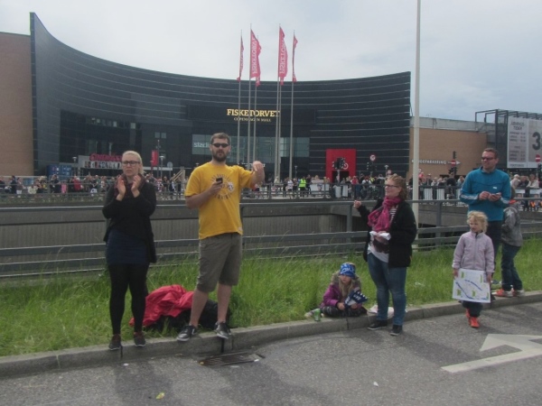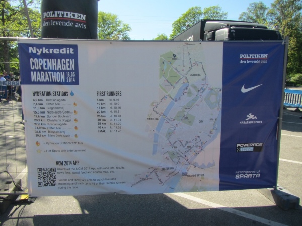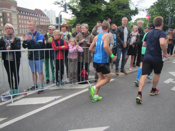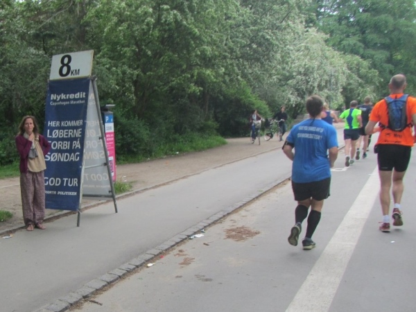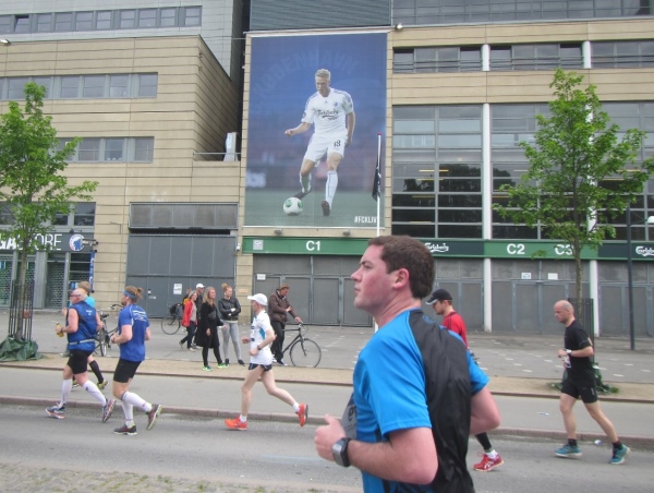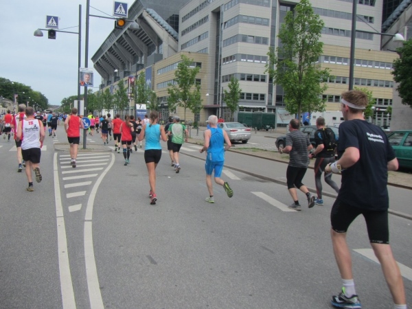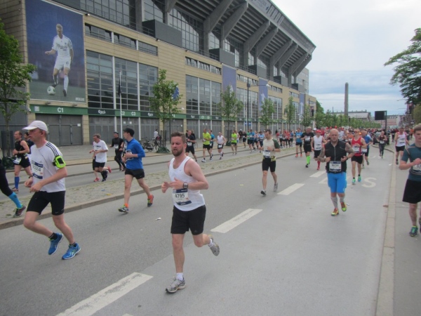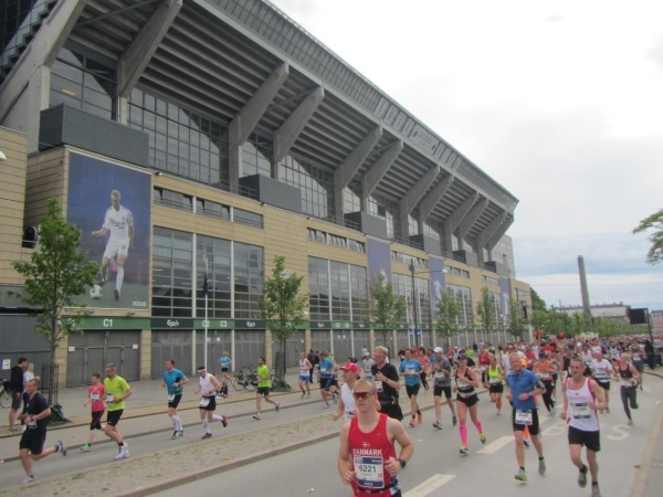 Der Marathonkurs in Kopenhagen hat viele Wenden, das konnte ich gestern auf der Expo an der Karte gut erkennen. Manche Zuschauer haben einen Folder in ihren Händen, auf denen die Strecke abgebildet ist. Von der Nordre Frihavnsgade geht es nach 6 km nun in der Østeralle vorbei am Fußballstadion des FC Kopenhagen. Gleich darauf folgt die nächste Labe, die ich nicht beanspruche.