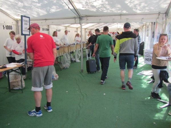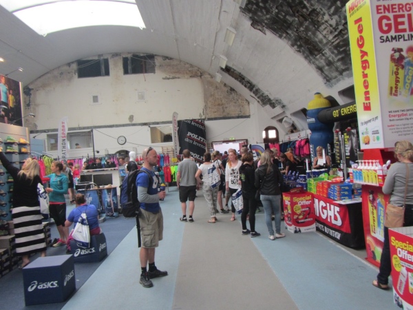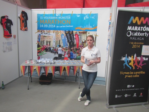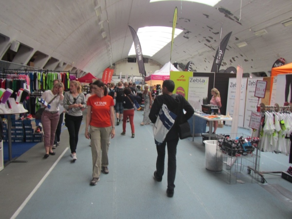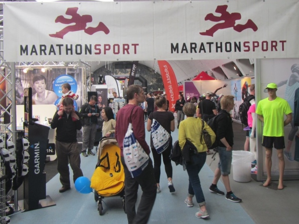 Ich habe schon deutlich größere Marathonmessen erlebt. Die hier in einem Zelt mit Nebentrakt zum Stadiongebäude unterbrachte Ausstellung ist wie der Name „Sparta“ schon sagt, ziemlich bescheiden aufgezogen. Auch ist der Andrang am frühen Nachmittag noch gering. Mag sein, dass viele der 10.000 registrierten Teilnehmer ihre Startnummern schon Tage davor abgeholt haben oder die lange Öffnungszeit am Samstag bis 20 Uhr nutzen und später kommen.
