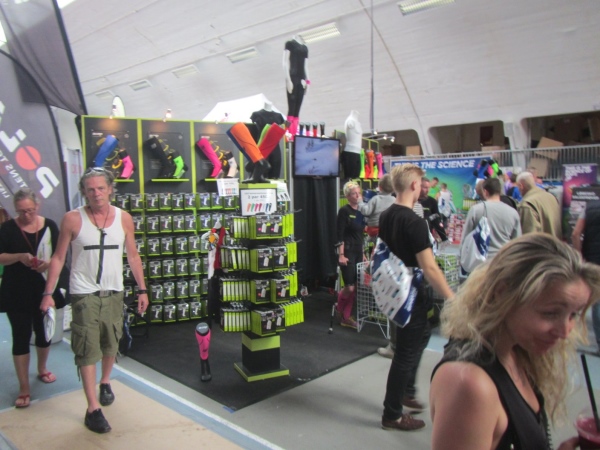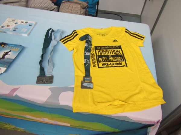 Das Startpaket enthält die mir zugeteilte Nummer 4237 mit auf der Rückseite integriertem Chip, einen übergroßen Kleidersack und ein schickes Funktionsshirt in schwarz. Einige deutsche Marathonlaufveranstalter sind mit einem eigenen Stand vertreten, neben Berlin, auch Düsseldorf und Münster. Den Marathon von Nice nach Cannes, der hier beworben wird, bin ich 2011 schon gelaufen, ebenso Amsterdam.