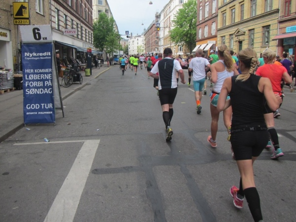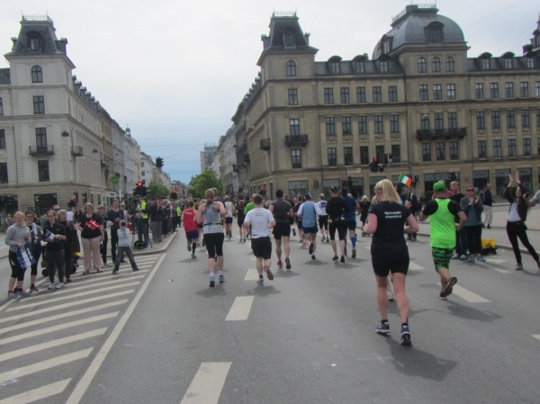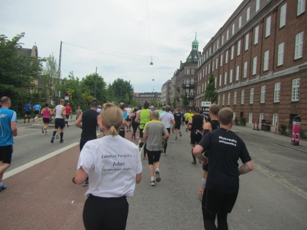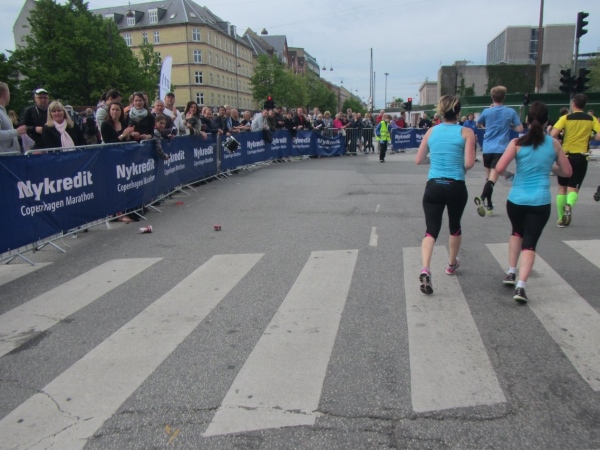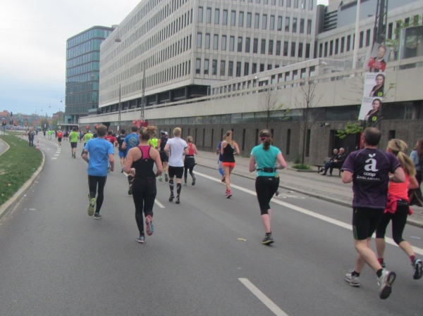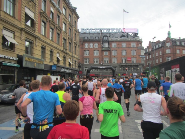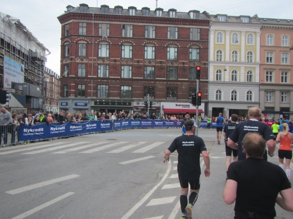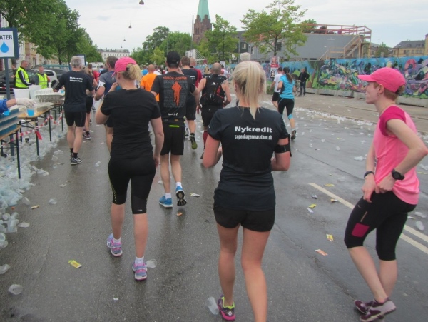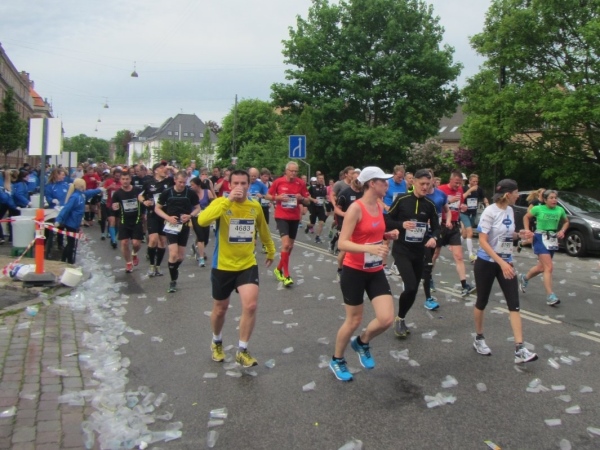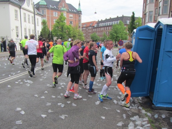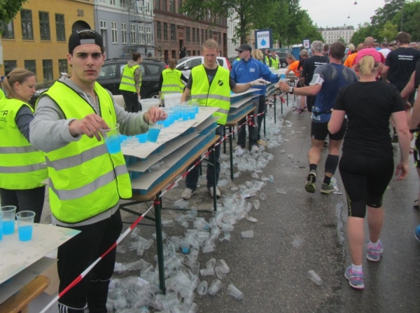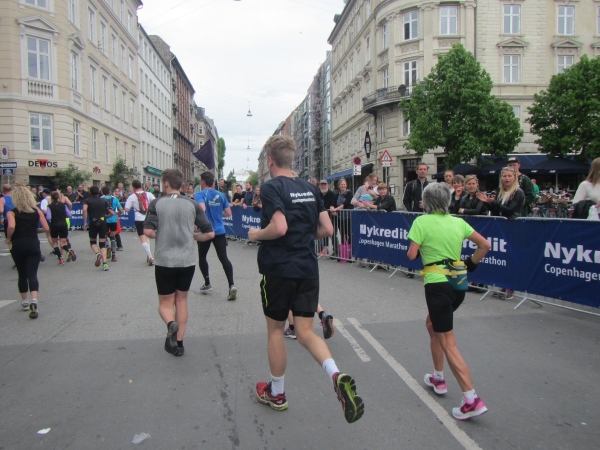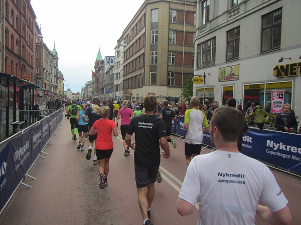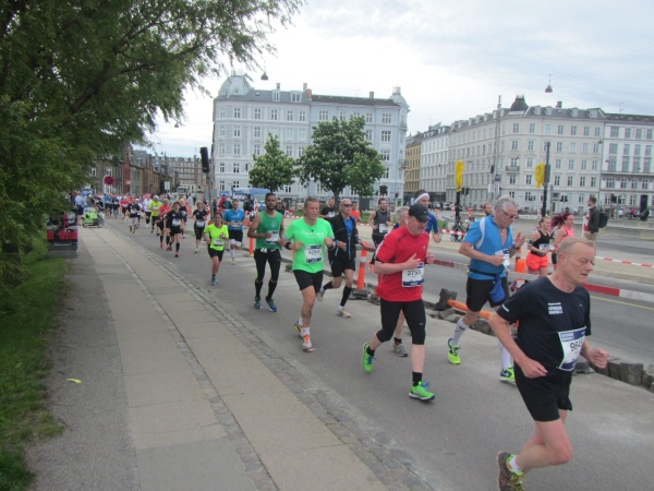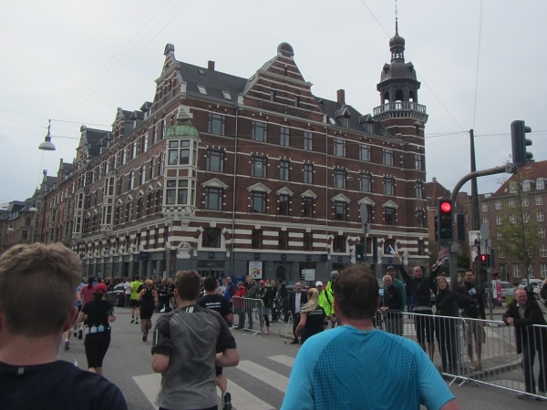 Der Kurs führt nun die Øster Voldgade nach Norden bis zur Østerport Bahnstation, wo bald darauf bei der Kristianiagade sich die erste Labestation befindet und 5 km erreicht sind. Ich pflege den Wasserbecher immer beim letzten Tisch zu fassen, da ist das Gedränge der nachrückenden Läufer geringer. Auch eine kleine Gehpause von 15 bis 30 Sekunden sollte man sich erlauben. Jeff Galloway, der US-amerikanische Laufguru, empfiehlt überhaupt lange Gehpausen, damit man bei einem Marathon sicher (allerdings über 5 Stunden) finishen kann.