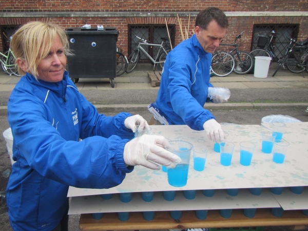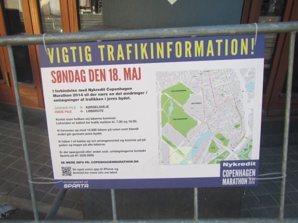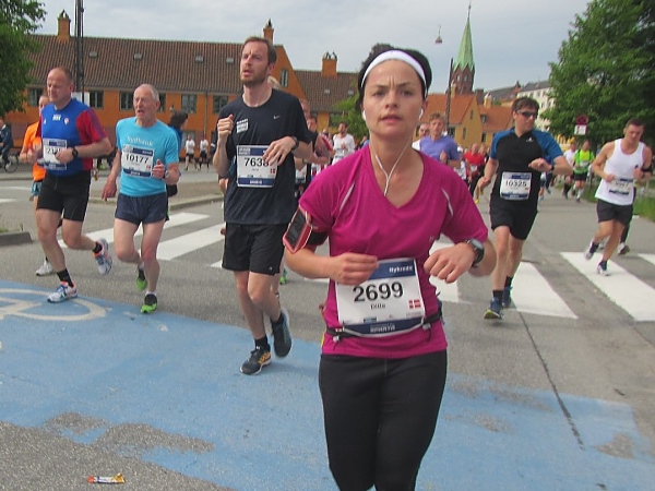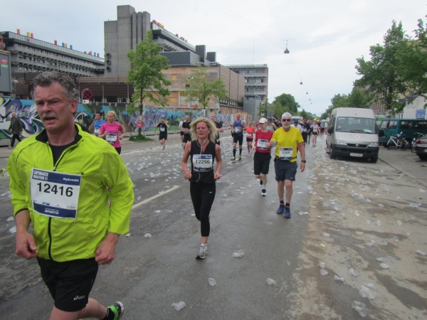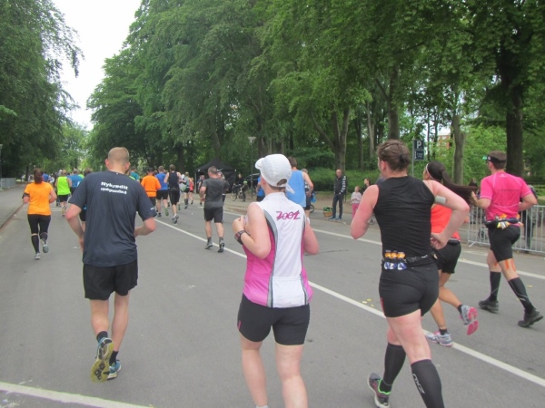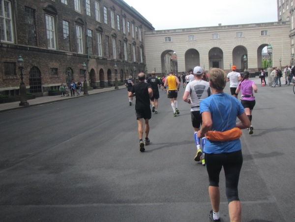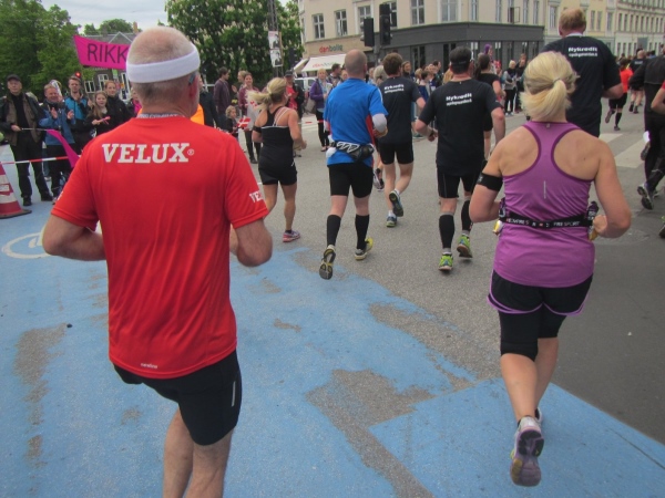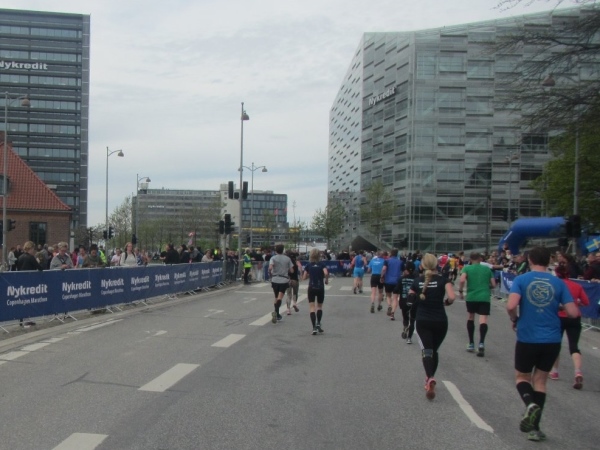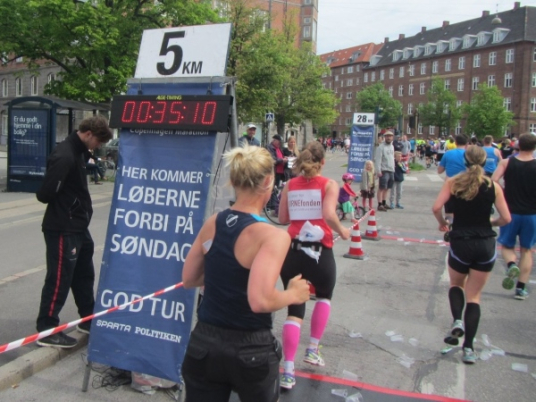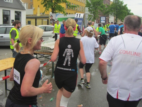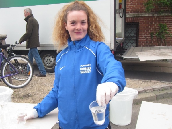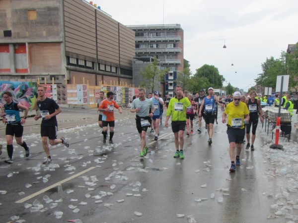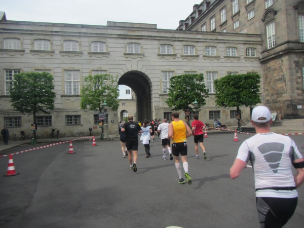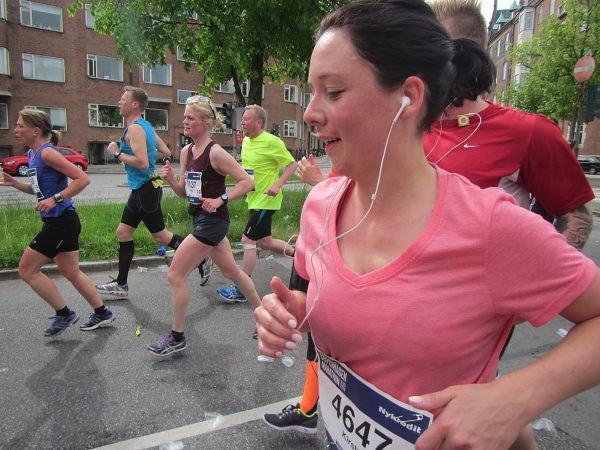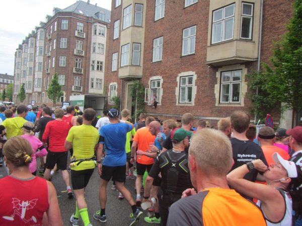 Der Kurs führt nun die Øster Voldgade nach Norden bis zur Østerport Bahnstation, wo bald darauf bei der Kristianiagade sich die erste Labestation befindet und 5 km erreicht sind. Ich pflege den Wasserbecher immer beim letzten Tisch zu fassen, da ist das Gedränge der nachrückenden Läufer geringer. Auch eine kleine Gehpause von 15 bis 30 Sekunden sollte man sich erlauben. Jeff Galloway, der US-amerikanische Laufguru, empfiehlt überhaupt lange Gehpausen, damit man bei einem Marathon sicher (allerdings über 5 Stunden) finishen kann.
