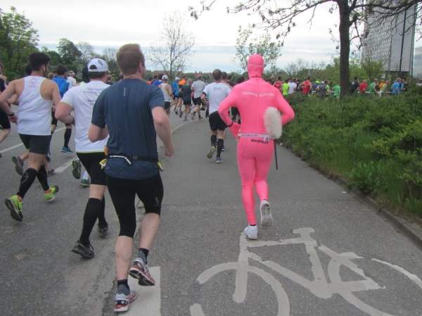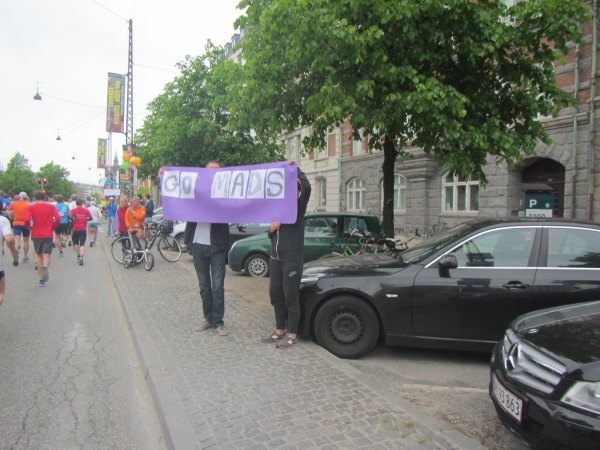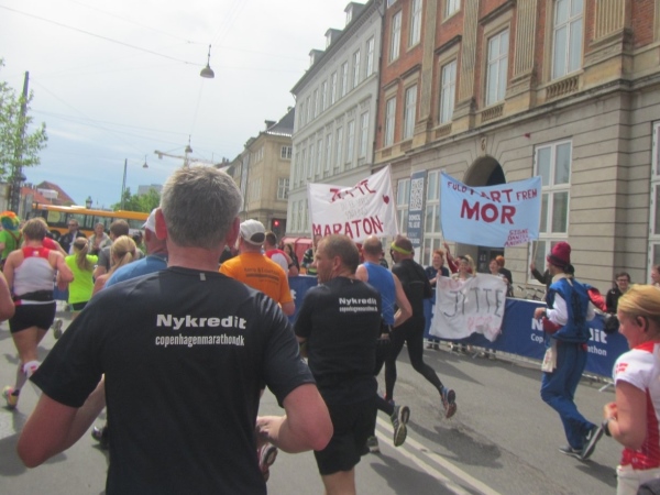Die hinter mir nachkommenden Läufer/innen strotzen förmlich vor Energie. Man erkennt an der Körpersprache, dass 3:50er-Finisher für den Marathon zumeist ordentlich trainiert haben. Nach 3 km ist das Feld inzwischen schon weit auseinander gezogen. Nicht nur am Start hinter den Absperrungen, sondern auch entlang der H.C. Andersen BLV stehen auf der für den Verkehr gesperrten Seite der Straße viele applaudierende Zuschauer am Gehsteig. Ein Mann zeigt ein Transparent, auf dem zu lesen steht: „Run like any angry Kenyan“. Ich bin inzwischen von Hunderten Marathonis überholt worden, sie alle haben es sehr eilig.