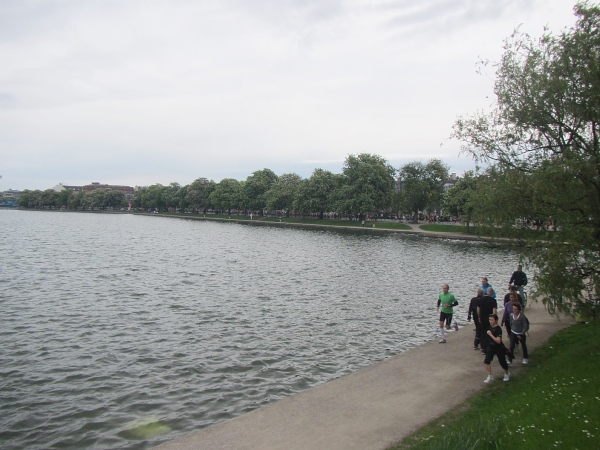 Die Schlaufe danach führt die Läufer/innen wieder in die Nähe der Nordre Frihavnsgade zurück, bevor der Kurs nach Südosten in die Øster Søgade abzweigt. Zur Rechten befindet sich der Sortedams Sø mit herrlichem Blick auf das Wasser und mit Bänken unter noch blühenden Kastanienbäumen. Gestern bin ich hier vorbeispaziert, heute ist das Wetter jedoch längst nicht mehr so einladend.